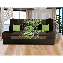 Tato rozkládací pohovka s úložným prostorem má textilní potah v barevném provedení hnědá /zelená. Světlejší pruh a motiv květů na sedací a opěradlové části může být umístěn i v jiné poloze, než je na obrázku. Pohovka má jádro z vlnité pružiny. Výška sedu je 40 cm, hloubka sedu 55 cm. Rozměr rozložené pohovky je 190 × 120 cm. Způsob rozkládání KLIK-KLAK (postup uveden v návodu k montáži). Po složení do polohy k sedu upravte krycí látku v zadní části tak, aby zakryla rozkládací mechanizmus. Zboží dodáváme v demontu.