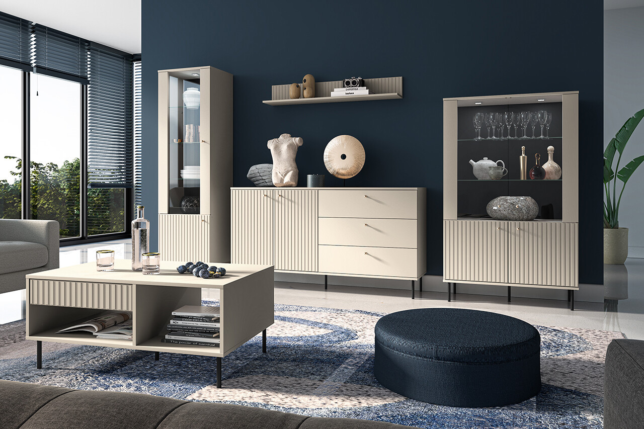 Police SOPHIE je vyrobena z vysoce kvalitní laminované dřevotřískové desky s ABS hranou v kašmírové barvě. Vyznačuje se stylovými černými kovovými nohami a drážkovanými předními čílky se zlatými úchytkami. Kuličkové vodítka a panty s tichým zavíráním zajišťují komfort používání. Zboží dodáváme v demontu.