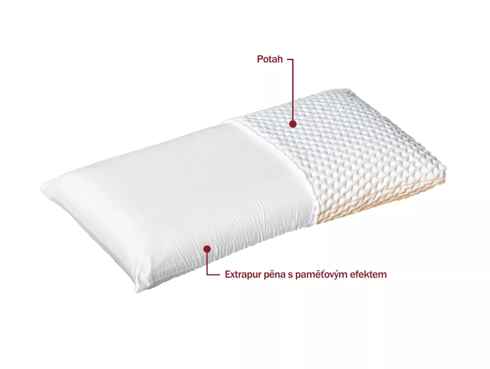 Polštář obdélníkového tvaru z nové jedinečné pěny EXTRAPUR, která se díky paměťovému efektu přizpůsobí tvaru hlavy a rovnoměrně rozloží váhu těla. Poskytuje optimální oporu hlavy a úlevu krčním svalům během spánku. Pěna je ekologická a velmi prodyšná.