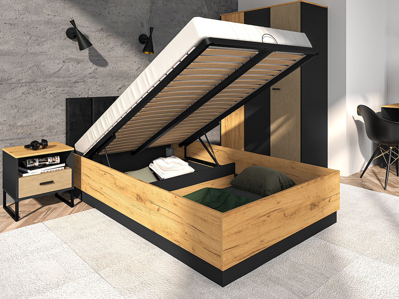 Postel Colt je vyrobena z vysoce kvalitní laminované dřevotřískové desky s ABS hranou korpus v  dezénu dub craft zlatý/černá v matném provedení. Čalouněné čelo a rošt se zvedákem v ceně. Matrace není součástí, je nutné ji doobjednat samostatně. Zboží dodáváme v demontu.
