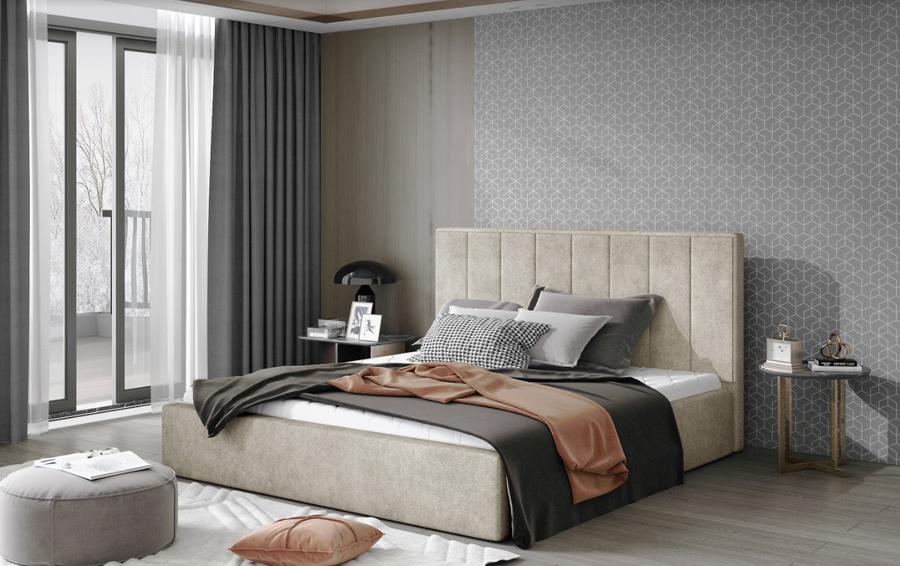 Postel Audrey je jednoduchý kus nábytku obohacený o zajímavé čelo postele v dezénu Dora 21 (krémová). Až 93 cm s měkkým a elegantním povrchem vytváří nejen dekorativní funkci, ale také velkou plochu, kterou lze použít jako oporu při večerním sezení. Postel je s kovovým rámem a plynovým zvedákem, díky čemuž získáváme nádobu na ložní prádlo, kterou lze snadno a tiše zvednout bez použití síly. Svislé prošívání perfektně zapadne do interiérů ovládaných geometrickými doplňky. Součastí postele není matrace a doplňky uvedené na obrázku. Postel je k dispozici ve čtyřech velikostech. Spací plocha 140 x 200 cm. Zboží dodáváme v demontu.