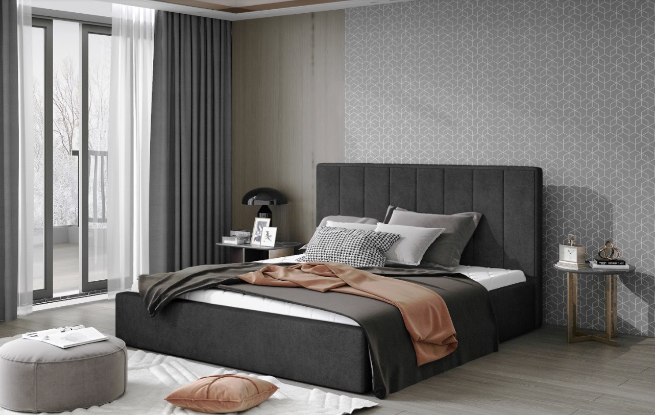 Postel Audrey je jednoduchý kus nábytku obohacený o zajímavé čelo postele v dezénu Dora 96 (tmavě šedá). Až 93 cm s měkkým a elegantním povrchem vytváří nejen dekorativní funkci, ale také velkou plochu, kterou lze použít jako oporu při večerním sezení. Postel je s kovovým rámem a plynovým zvedákem, díky čemuž získáváme nádobu na ložní prádlo, kterou lze snadno a tiše zvednout bez použití síly. Svislé prošívání perfektně zapadne do interiérů ovládaných geometrickými doplňky. Součastí postele není matrace a doplňky uvedené na obrázku. Postel je k dispozici ve čtyřech velikostech. Spací plocha 200 x 200 cm. Zboží dodáváme v demontu.