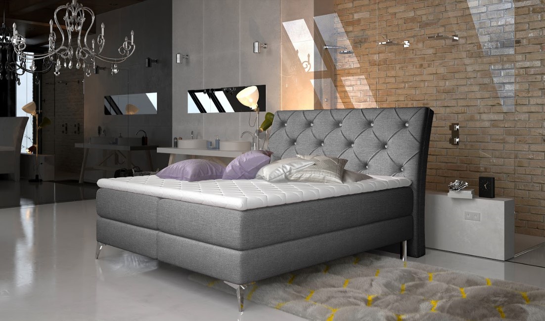 Moderní postel je vybavena elegantními kovovými nohami se stříbrným leskem o výšce 13 cm. Čelo postele je prohnuté, je zdobeno prošíváním s krystaly. Pro dosažení optimálního pohodlí byla použita 20 cm vysoká pružinová matrace typu bonnel, která je vybavena z každé strany vrstvou PUR pěny T25. Pro lepší pohodlí je vrchní část postele doplněna o 4 cm podložku z pěny T21. Postel má dva úložné prostory na lůžkoviny. Potahová látka jako na hlavní fotografii - šedá látka. Maximální nosnost jedné postele 110 kg.