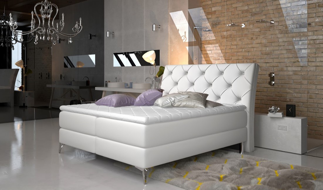 Moderní postel je vybavena elegantními kovovými nohami se stříbrným leskem o výšce 13 cm. Čelo postele je prohnuté, je zdobeno prošíváním s krystaly. Pro dosažení optimálního pohodlí byla použita 20 cm vysoká pružinová matrace typu bonnel, která je vybavena z každé strany vrstvou PUR pěny T25. Pro lepší pohodlí je vrchní část postele doplněna o 4 cm podložku z pěny T21. Postel má dva úložné prostory na lůžkoviny. Potahová látka jako na hlavní fotografii - bílá eko kůže. Maximální nosnost jedné postele 110 kg.