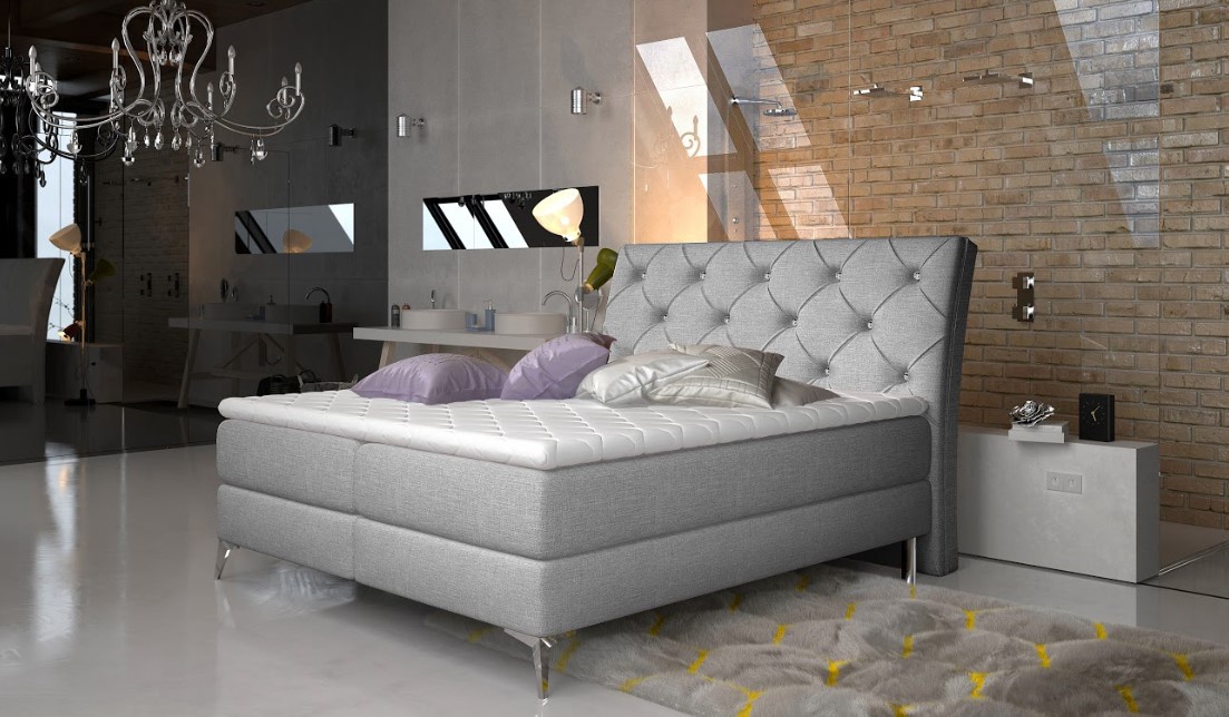 Moderní postel je vybavena elegantními kovovými nohami se stříbrným leskem o výšce 13 cm. Čelo postele je prohnuté, je zdobeno prošíváním s krystaly. Pro dosažení optimálního pohodlí byla použita 20 cm vysoká pružinová matrace typu bonnel, která je vybavena z každé strany vrstvou PUR pěny T25. Pro lepší pohodlí je vrchní část postele doplněna o 4 cm podložku z pěny T21. Postel má dva úložné prostory na lůžkoviny. Potahová látka jako na hlavní fotografii - světle šedá látka. Postel boxspring není určena do prostoru, nemá očalouněná záda (očalounění zad za příplatek, na dotaz). Maximální nosnost jedné postele 110 kg.