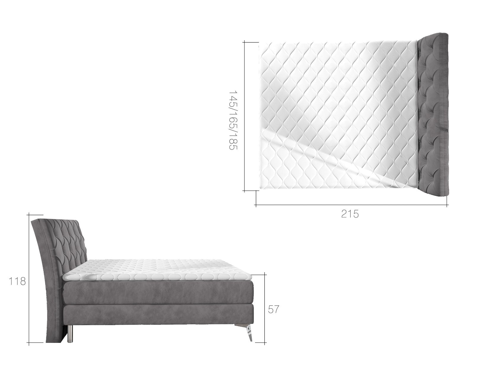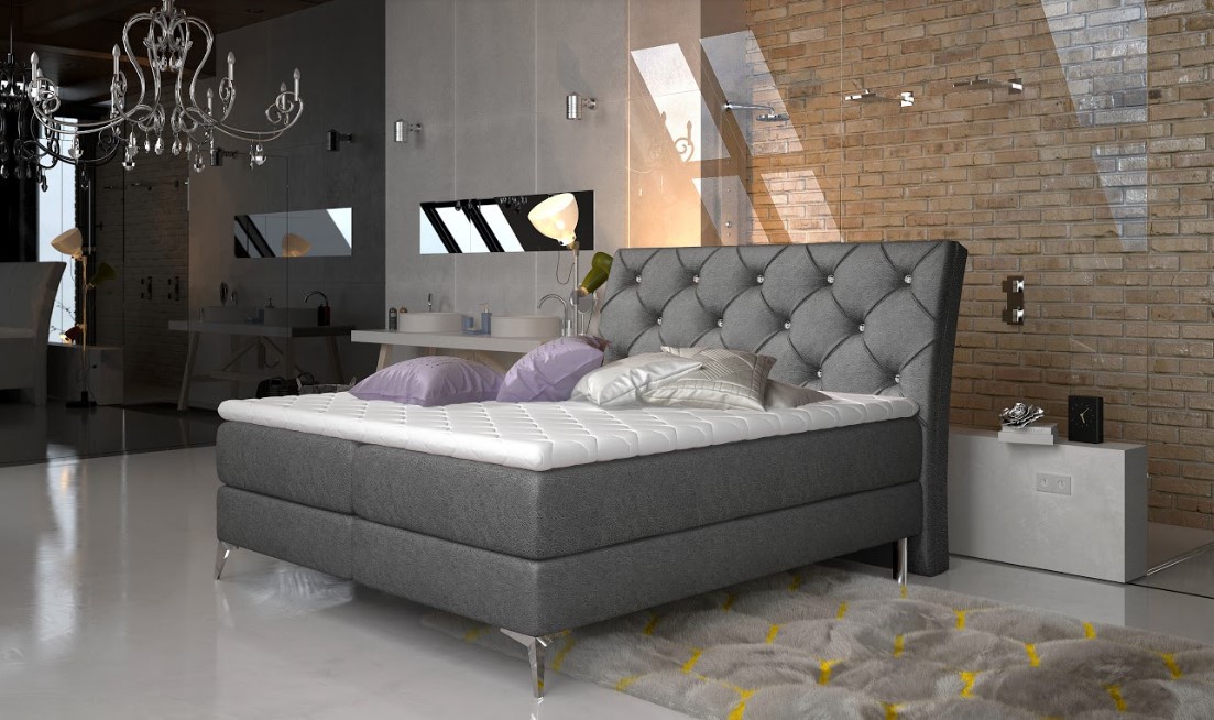 Moderní postel je vybavena elegantními kovovými nohami se stříbrným leskem o výšce 13 cm. Čelo postele je prohnuté, je zdobeno prošíváním s krystaly. Pro dosažení optimálního pohodlí byla použita 20 cm vysoká pružinová matrace typu bonnel, která je vybavena z každé strany vrstvou PUR pěny T25. Pro lepší pohodlí je vrchní část postele doplněna o 4 cm podložku z pěny T21. Postel má dva úložné prostory na lůžkoviny. Potahová látka jako na hlavní fotografii - šedá látka. Postel boxspring není určena do prostoru, nemá očalouněná záda (očalounění zad za příplatek, na dotaz). Maximální nosnost jedné postele 110 kg.