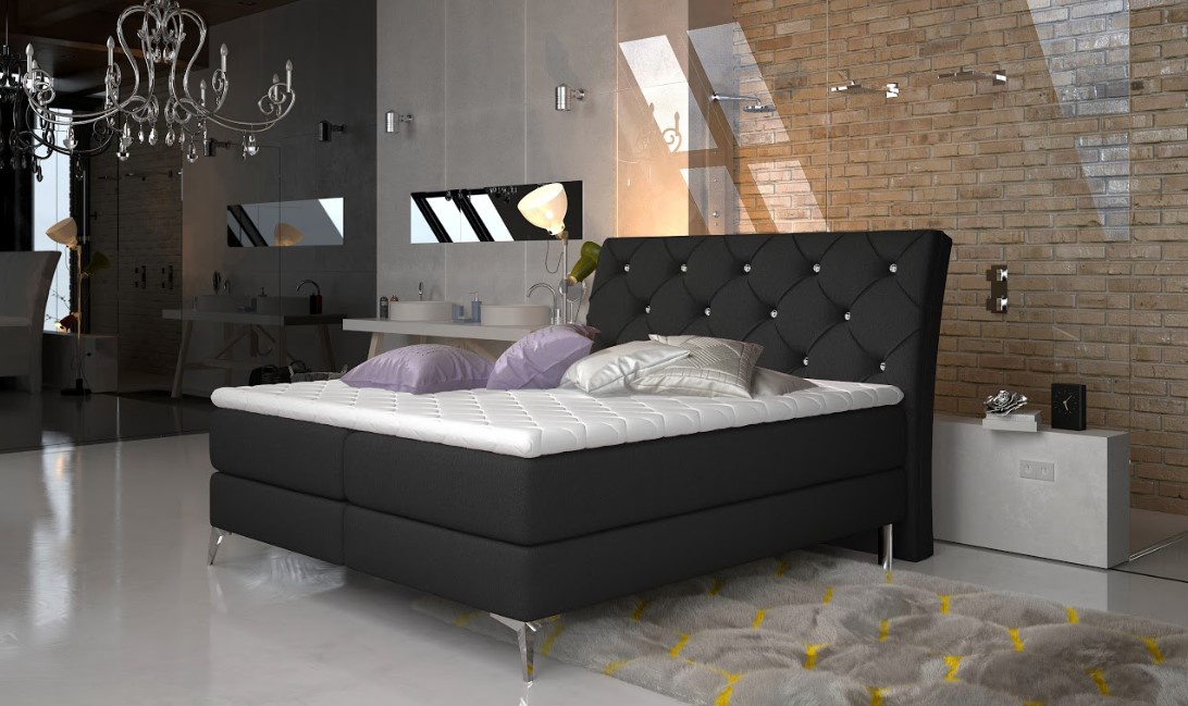 Moderní postel je vybavena elegantními kovovými nohami se stříbrným leskem o výšce 13 cm. Čelo postele je prohnuté, je zdobeno prošíváním s krystaly. Pro dosažení optimálního pohodlí byla použita 20 cm vysoká pružinová matrace typu bonnel, která je vybavena z každé strany vrstvou PUR pěny T25. Pro lepší pohodlí je vrchní část postele doplněna o 4 cm podložku z pěny T21. Postel má dva úložné prostory na lůžkoviny. Potahová látka jako na hlavní fotografii - černá látka. Postel boxspring není určena do prostoru, nemá očalouněná záda (očalounění zad za příplatek, na dotaz). Maximální nosnost jedné postele 110 kg.