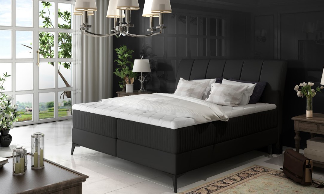 Díky kombinaci pohodlí s elegancí se v posteli probudíte velice odpočinutí a svěží. Postel je potažená materiálem příjemným na dotek, odolným proti oděru a vyblednutí. Postel je vybavena vysokým, mírně skloněným čelem a černými kovovými nohami o výšce 13 cm. Postel disponuje dvěma úložnými prostory.