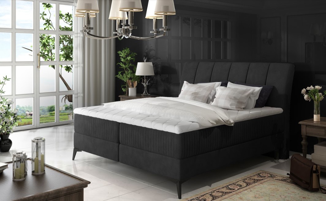 Matrace vysoká 20 cm je odolná proti vysokému zatížení. Na ní je položena další vrstva z pěny T30 o výšce 4 cm. Obojí zaručuje maximální pohodlí při zachování dostatečné podpory těla během spánku. Potahová látka jako na hlavní fotografii - černá látka. Postel boxspring není určena do prostoru, nemá očalouněná záda (očalounění zad za příplatek, na dotaz). Maximální nosnost jednoho lůžka 110 kg.