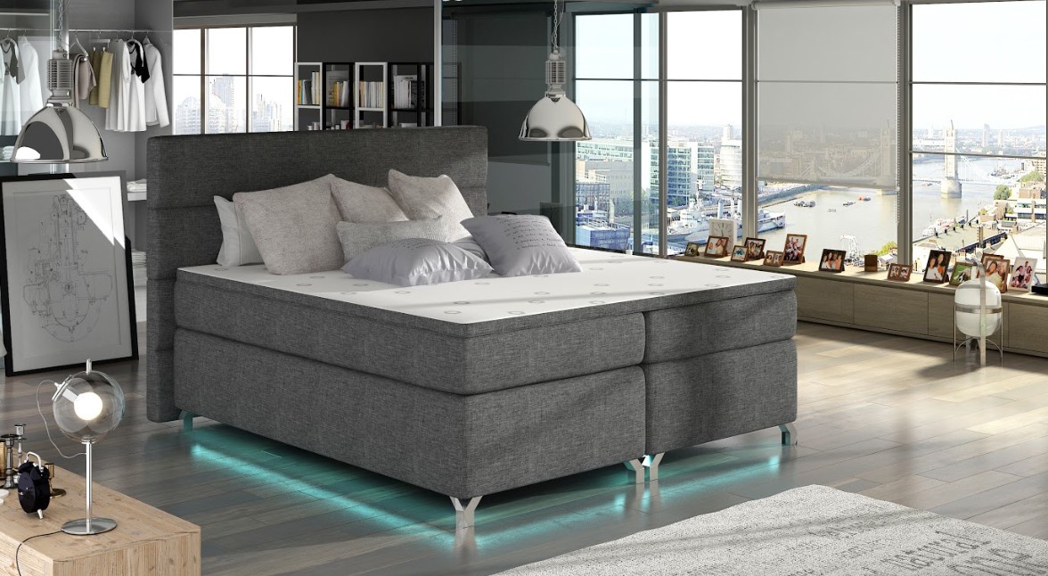 Při výběru postele se rozhodněte pro model, který vám nejen poskytne pohodlný spánek, ale také elegantní vzhled. To vše postel AMADEO splňuje. Masivní konstrukce, vysoká matrace, stylové čelo vybavené přídavnou pěnou T21 a vodorovným prošíváním v kombinaci s vysokými, kovovými, chromovými nohami s vysokým leskem a elegantním čalouněním odolným vůči oděru a nečistotám, poskytuje mimořádný zážitek. Postel disponuje dvěma úložnými prostory. Matrace je vyplněna pružinami bonnel a dvěma dalšími vrstvami pěny T25 umístěnými v horní a dolní části matrace. Maximální komfort zajistí druhá vrstva, přistýlka o výšce 4 cm vyrobená z pěny T21. Součástí postele je LED osvětlení. Potahová látka jako na hlavním obrázku - tmavě šedá látka. Postel boxspring není určena do prostoru, nemá očalouněná záda (očalounění zad za příplatek, na dotaz). Maximální nosnost jedné postele 110 kg.