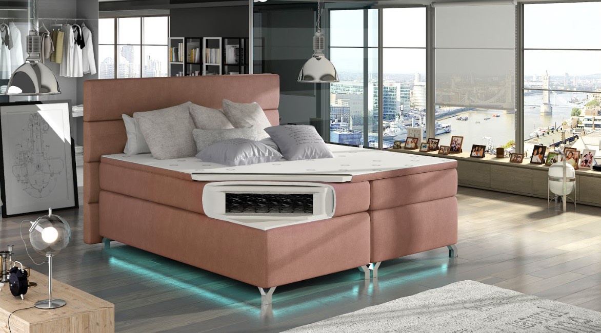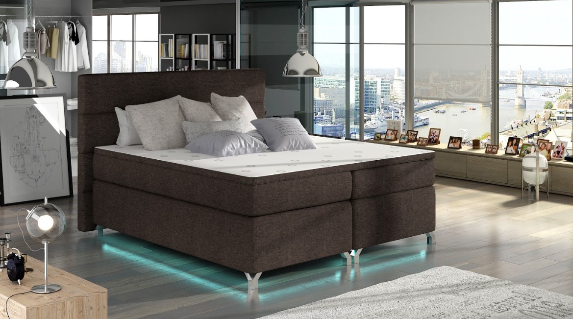 Při výběru postele se rozhodněte pro model, který vám nejen poskytne pohodlný spánek, ale také elegantní vzhled. To vše postel AMADEO splňuje. Masivní konstrukce, vysoká matrace, stylové čelo vybavené přídavnou pěnou T21 a vodorovným prošíváním v kombinaci s vysokými, kovovými, chromovými nohami s vysokým leskem a elegantním čalouněním odolným vůči oděru a nečistotám, poskytuje mimořádný zážitek. Postel disponuje dvěma úložnými prostory. Matrace je vyplněna pružinami bonnel a dvěma dalšími vrstvami pěny T25 umístěnými v horní a dolní části matrace. Maximální komfort zajistí druhá vrstva, přistýlka o výšce 4 cm vyrobená z pěny T21. Součástí postele je LED osvětlení. Potahová látka jako na hlavním obrázku - tmavě hnědá látka. Postel boxspring není určena do prostoru, nemá očalouněná záda (očalounění zad za příplatek, na dotaz). Maximální nosnost jedné postele 110 kg.
