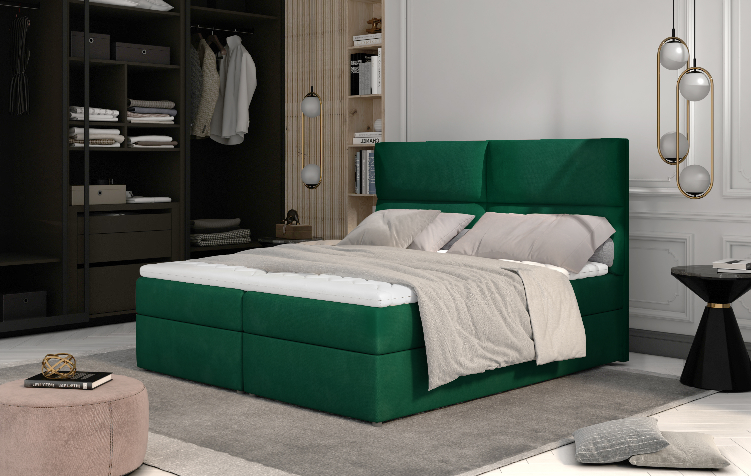 Postel boxspring Amber v provedení Kronos 19 je vyrobena v kombinací dřeva a dřevotřísky. Oboustranná pružinová matrace typu Bonnel je vybavena z každé strany vrstvou PUR pěny T25. Tvrdost matrace H3 má potah na zip, který je pratelný na 40 st. - je hypoalergenní. Výška této matrace je 15 cm. Vrchní část postele je doplněna o tooper z pěny o výšce 3 cm. Postel má dva úložné prostory. Maximální nosnost jedné postele 110 kg. Nožky jsou plastové o výšce 3 cm. Zboží dodáváme v demontu.