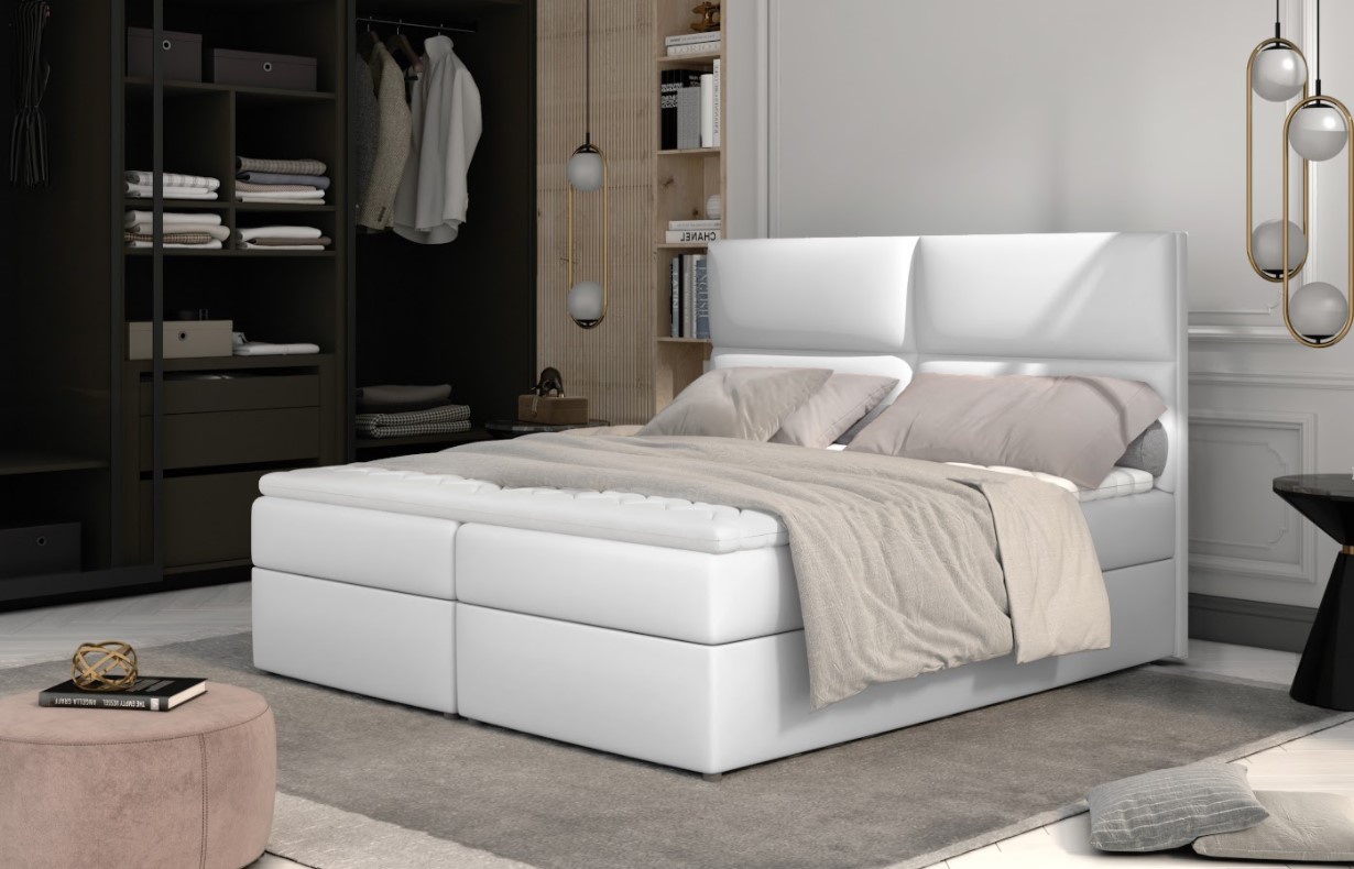 Postel Boxspring Amber s úložným prostorem na první pohled zaujme elegantním designem. Postel je vyrobena v kombinací dřeva a dřevotřísky s pěkným čalouněním z příjemného materiálu. Postel disponuje několika vkusnými doplňky jako je prošívané čelo či kovové nožky. Pro dosažení optimálního pohodlí byla použita 15 cm vysoká oboustranná pružinová matrace typu Bonnel, která je vybavena z každé strany vrstvou PUR pěny T25. Tvrdost matrace H3 má potah na zip, který je pratelný na 40 st. - je hypoalergenní. Pro lepší pohodlí je vrchní část postele doplněna o tooper z pěny, který je vysoký 3 cm. Postel má dva úložné prostory na lůžkoviny. Boxspring zajišťuje dokonalou cirkulaci vzduchu a odvádí tak většinu vlhkosti mimo lůžko. Potahová látka jako na hlavní fotografii - bílá látka. Na výběr máte z mnoha barevných variant. Maximální nosnost jedné postele 110 kg. Zboží dodáváme v demontu.