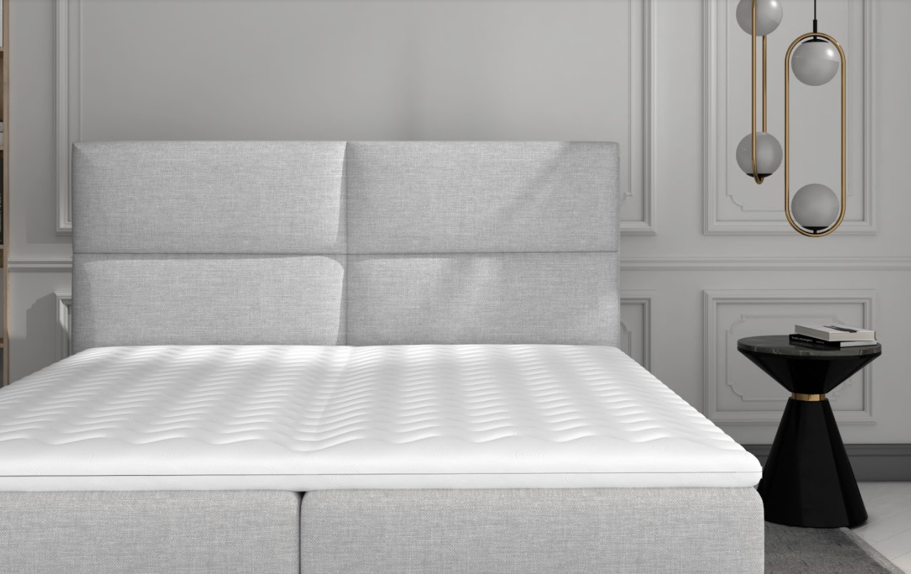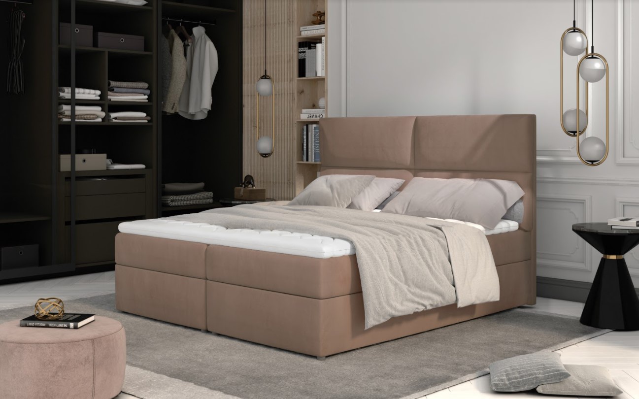 Postel Boxspring Amber s úložným prostorem na první pohled zaujme elegantním designem. Postel je vyrobena v kombinací dřeva a dřevotřísky s pěkným čalouněním z příjemného materiálu. Postel disponuje několika vkusnými doplňky jako je prošívané čelo či kovové nožky. Pro dosažení optimálního pohodlí byla použita 15 cm vysoká oboustranná pružinová matrace typu Bonnel, která je vybavena z každé strany vrstvou PUR pěny T25. Tvrdost matrace H3 má potah na zip, který je pratelný na 40 st. - je hypoalergenní. Pro lepší pohodlí je vrchní část postele doplněna o tooper z pěny, který je vysoký 4 cm. Postel má dva úložné prostory na lůžkoviny. Boxspring zajišťuje dokonalou cirkulaci vzduchu a odvádí tak většinu vlhkosti mimo lůžko. Potahová látka jako na hlavní fotografii - béžová látka. Na výběr máte z mnoha barevných variant. Maximální nosnost jedné postele 110 kg. Zboží dodáváme v demontu.