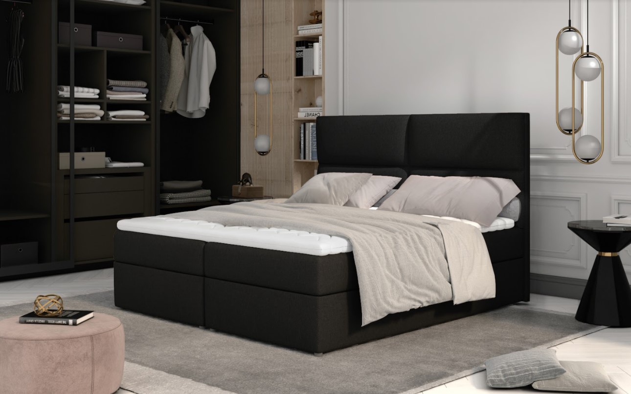 Postel Boxspring Amber s úložným prostorem na první pohled zaujme elegantním designem. Postel je vyrobena v kombinací dřeva a dřevotřísky s pěkným čalouněním z příjemného materiálu. Postel disponuje několika vkusnými doplňky jako je prošívané čelo či kovové nožky. Pro dosažení optimálního pohodlí byla použita 15 cm vysoká oboustranná pružinová matrace typu Bonnel, která je vybavena z každé strany vrstvou PUR pěny T25. Tvrdost matrace H3 má potah na zip, který je pratelný na 40 st. - je hypoalergenní. Pro lepší pohodlí je vrchní část postele doplněna o tooper z pěny, který je vysoký 4 cm. Postel má dva úložné prostory na lůžkoviny. Boxspring zajišťuje dokonalou cirkulaci vzduchu a odvádí tak většinu vlhkosti mimo lůžko. Potahová látka jako na hlavní fotografii - černá látka. Na výběr máte z mnoha barevných variant. Maximální nosnost jedné postele 110 kg. Zboží dodáváme v demontu.