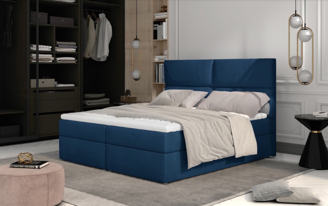 Postel Boxspring Amber s úložným prostorem na první pohled zaujme elegantním designem. Postel je vyrobena v kombinací dřeva a dřevotřísky s pěkným čalouněním z příjemného materiálu. Postel disponuje několika vkusnými doplňky jako je prošívané čelo či kovové nožky. Pro dosažení optimálního pohodlí byla použita 15 cm vysoká oboustranná pružinová matrace typu Bonnel, která je vybavena z každé strany vrstvou PUR pěny T25. Tvrdost matrace H3 má potah na zip, který je pratelný na 40 st. - je hypoalergenní. Pro lepší pohodlí je vrchní část postele doplněna o tooper z pěny, který je vysoký 4 cm. Postel má dva úložné prostory na lůžkoviny. Boxspring zajišťuje dokonalou cirkulaci vzduchu a odvádí tak většinu vlhkosti mimo lůžko. Potahová látka jako na hlavní fotografii - modrá látka. Na výběr máte z mnoha barevných variant. Maximální nosnost jedné postele 110 kg. Zboží dodáváme v demontu.