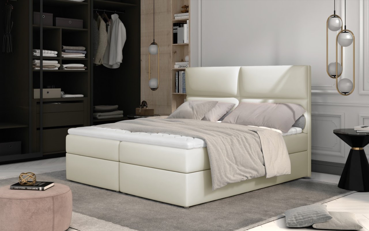 Postel Boxspring Amber s úložným prostorem na první pohled zaujme elegantním designem. Postel je vyrobena v kombinací dřeva a dřevotřísky s pěkným čalouněním z příjemného materiálu. Postel disponuje několika vkusnými doplňky jako je prošívané čelo či kovové nožky. Pro dosažení optimálního pohodlí byla použita 15 cm vysoká oboustranná pružinová matrace typu Bonnel, která je vybavena z každé strany vrstvou PUR pěny T25. Tvrdost matrace H3 má potah na zip, který je pratelný na 40 st. - je hypoalergenní. Pro lepší pohodlí je vrchní část postele doplněna o tooper z pěny, který je vysoký 4 cm. Postel má dva úložné prostory na lůžkoviny. Boxspring zajišťuje dokonalou cirkulaci vzduchu a odvádí tak většinu vlhkosti mimo lůžko. Potahová látka jako na hlavní fotografii - krémová látka. Na výběr máte z mnoha barevných variant. Maximální nosnost jedné postele 110 kg. Zboží dodáváme v demontu.