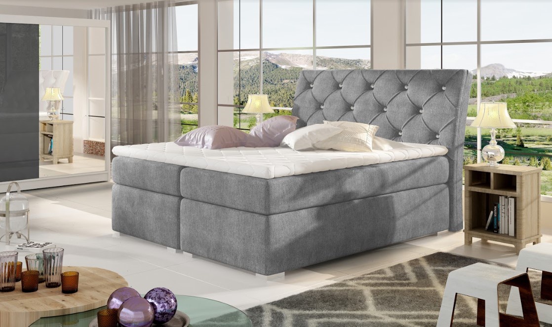 Elegantní postel disponuje vysokým čelem, prošívaným a ozdobeným krystaly. Materiál je příjemný na dotek a odolný vůči oděru a vyblednutí. Postel zdobí stříbrné kovové nohy. Pro dosažení optimálního pohodlí byla použita 20 cm vysoká pružinová matrace typu bonnel, která je vybavena z každé strany vrstvou PUR pěny T25. Pro lepší pohodlí je vrchní část postele doplněna o 4 cm podložku z pěny T21. Postel disponuje dvěma úložnými prostory, do kterých můžete uložit lůžkoviny. Exkluzivní výška ložné plochy 60 cm zajišťuje pohodlné vstávání. Potahová látka jako na hlavní fotografii - šedá látka. Postel boxspring není určena do prostoru, nemá očalouněná záda (očalounění zad za příplatek, na dotaz). Maximální nosnost jedné postele 110 kg.