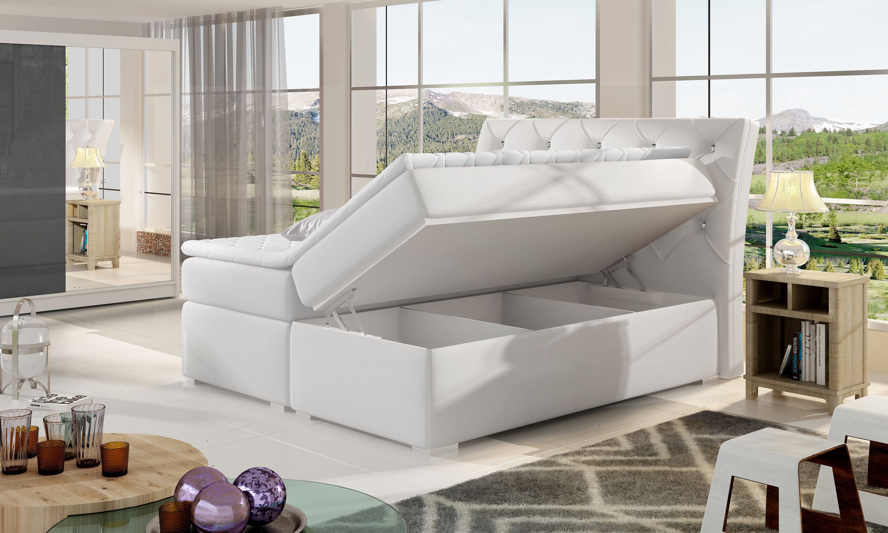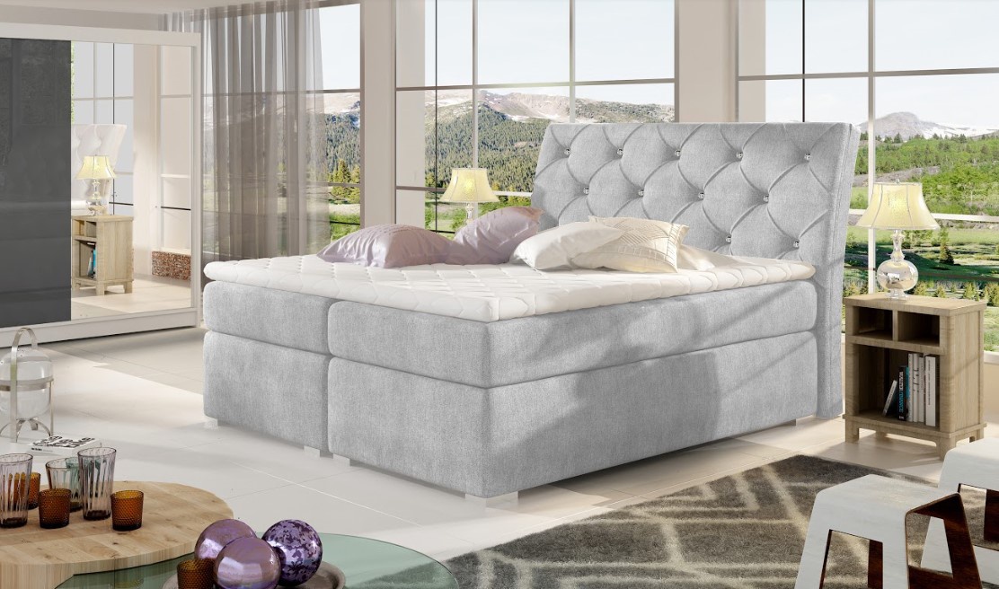 Elegantní postel disponuje vysokým čelem, prošívaným a ozdobeným krystaly. Materiál je příjemný na dotek a odolný vůči oděru a vyblednutí. Postel zdobí stříbrné kovové nohy. Pro dosažení optimálního pohodlí byla použita 20 cm vysoká pružinová matrace typu bonnel, která je vybavena z každé strany vrstvou PUR pěny T25. Pro lepší pohodlí je vrchní část postele doplněna o 4 cm podložku z pěny T21. Postel disponuje dvěma úložnými prostory, do kterých můžete uložit lůžkoviny. Exkluzivní výška ložné plochy 60 cm zajišťuje pohodlné vstávání. Potahová látka jako na hlavní fotografii - světle šedá látka. Postel boxspring není určena do prostoru, nemá očalouněná záda (očalounění zad za příplatek, na dotaz). Maximální nosnost jedné postele 110 kg.