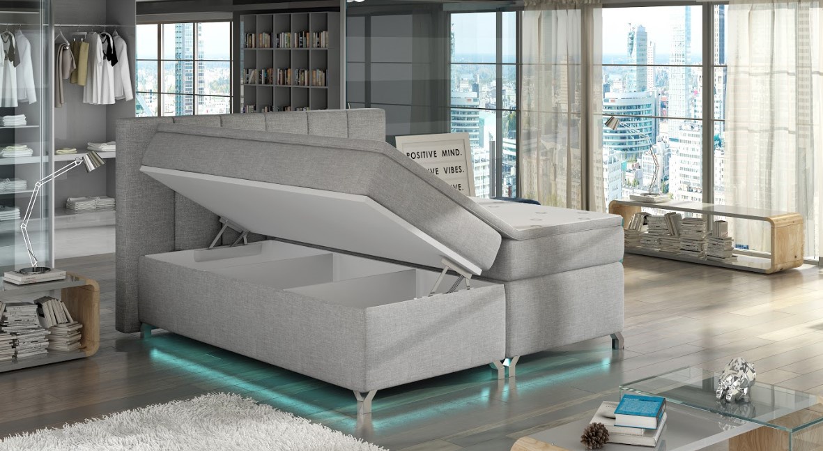 Při výběru postele se rozhodněte pro model, který vám nejen poskytne pohodlný spánek, ale také elegantní vzhled. To vše postel BASILIO splňuje. Masivní konstrukce, vysoká matrace, stylové čelo vybavené přídavnou pěnou T21 a svislým prošíváním v kombinaci s vysokými, kovovými, chromovými nohami s vysokým leskem a elegantním čalouněním odolným vůči oděru a nečistotám, poskytuje mimořádný zážitek. Postel disponuje dvěma úložnými prostory. Matrace je vyplněna pružinami bonnel a dvěma dalšími vrstvami pěny T25 umístěnými v horní a dolní části matrace. Maximální komfort zajistí druhá vrstva, přistýlka o výšce 4 cm vyrobená z pěny T21. Součástí postele je LED osvětlení. Potahová látka jako na hlavním obrázku - béžová látka. Maximální nosnost jedné postele 110 kg.