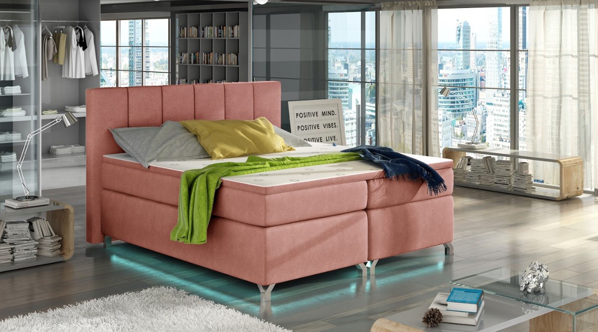 Při výběru postele se rozhodněte pro model, který vám nejen poskytne pohodlný spánek, ale také elegantní vzhled. To vše postel BASILIO splňuje. Masivní konstrukce, vysoká matrace, stylové čelo vybavené přídavnou pěnou T21 a svislým prošíváním v kombinaci s vysokými, kovovými, chromovými nohami s vysokým leskem a elegantním čalouněním odolným vůči oděru a nečistotám, poskytuje mimořádný zážitek. Postel disponuje dvěma úložnými prostory. Matrace je vyplněna pružinami bonnel a dvěma dalšími vrstvami pěny T25 umístěnými v horní a dolní části matrace. Maximální komfort zajistí druhá vrstva, přistýlka o výšce 4 cm vyrobená z pěny T21. Součástí postele je LED osvětlení. Potahová látka jako na hlavním obrázku - lososová látka. Maximální nosnost jedné postele 110 kg.