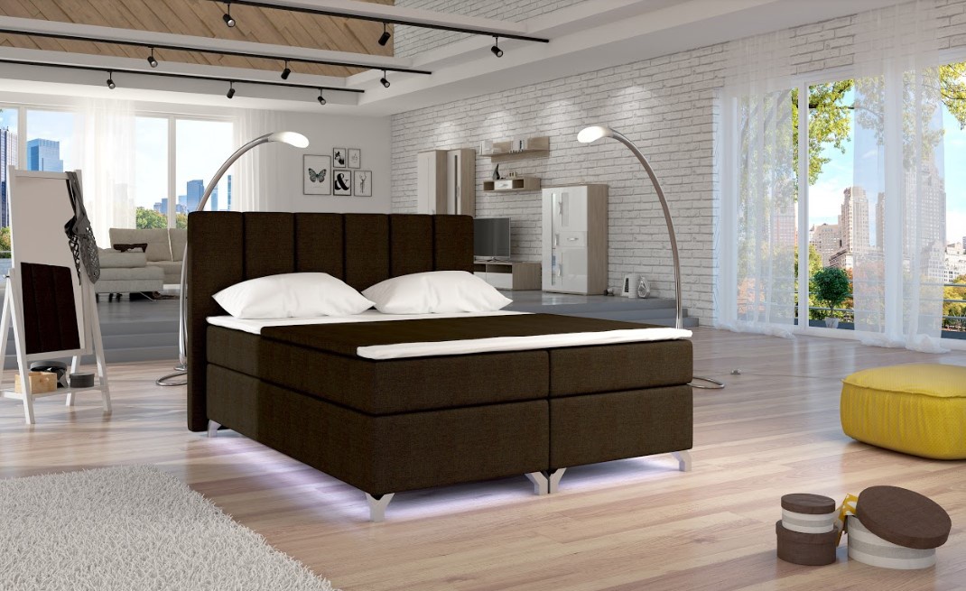 Při výběru postele se rozhodněte pro model, který vám nejen poskytne pohodlný spánek, ale také elegantní vzhled. To vše postel BASILIO splňuje. Masivní konstrukce, vysoká matrace, stylové čelo vybavené přídavnou pěnou T21 a svislým prošíváním v kombinaci s vysokými, kovovými, chromovými nohami s vysokým leskem a elegantním čalouněním odolným vůči oděru a nečistotám, poskytuje mimořádný zážitek. Postel disponuje dvěma úložnými prostory. Matrace je vyplněna pružinami bonnel a dvěma dalšími vrstvami pěny T25 umístěnými v horní a dolní části matrace. Maximální komfort zajistí druhá vrstva, přistýlka o výšce 4 cm vyrobená z pěny T21. Součástí postele je LED osvětlení. Potahová látka jako na hlavním obrázku - tmavě hnědá látka. Maximální nosnost jedné postele 110 kg.