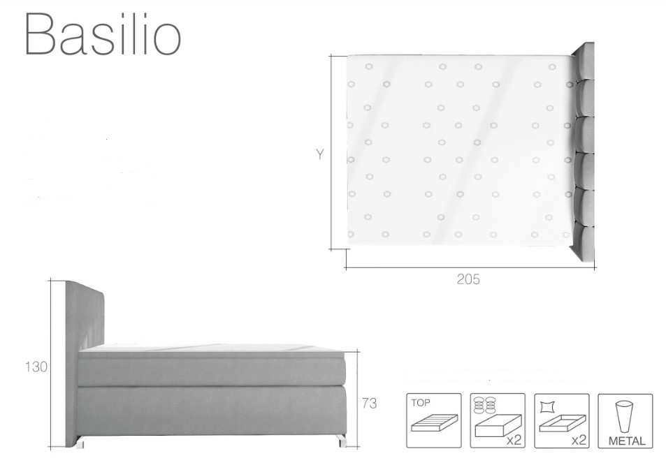 Při výběru postele se rozhodněte pro model, který vám nejen poskytne pohodlný spánek, ale také elegantní vzhled. To vše postel BASILIO splňuje. Masivní konstrukce, vysoká matrace, stylové čelo vybavené přídavnou pěnou T21 a svislým prošíváním v kombinaci s vysokými, kovovými, chromovými nohami s vysokým leskem a elegantním čalouněním odolným vůči oděru a nečistotám, poskytuje mimořádný zážitek. Postel disponuje dvěma úložnými prostory. Matrace je vyplněna pružinami bonnel a dvěma dalšími vrstvami pěny T25 umístěnými v horní a dolní části matrace. Maximální komfort zajistí druhá vrstva, přistýlka o výšce 4 cm vyrobená z pěny T21. Součástí postele je LED osvětlení. Potahová látka jako na hlavním obrázku - tmavě hnědá eko kůžePostel boxspring není určena do prostoru, nemá očalouněná záda (očalounění zad za příplatek, na dotaz). Maximální nosnost jedné postele 110 kg.