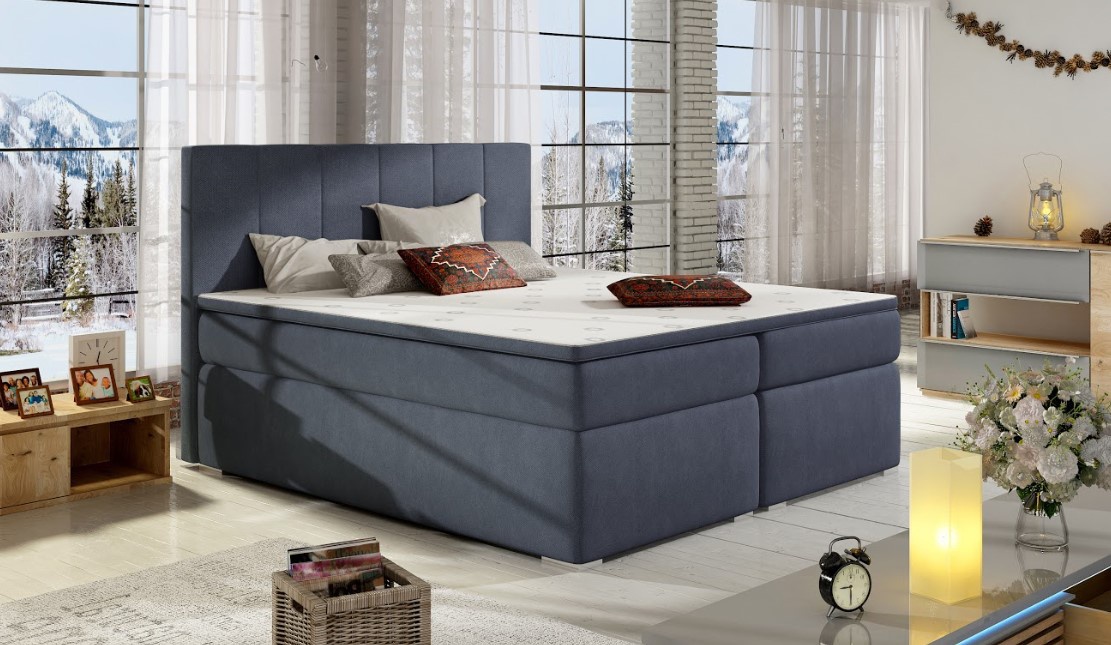 Elegantní postel disponuje vysokým, prošívaným čelem. Postel zdobí plastové nohy ve stříbrném dezénu. Pro dosažení optimálního pohodlí byla použita 20 cm vysoká pružinová matrace typu bonnel, která je vybavena z každé strany vrstvou PUR pěny T25. Pro lepší pohodlí je vrchní část postele doplněna o 4 cm podložku z pěny. Postel má dva úložné prostory, které můžete použít na uložení lůžkovin. Potahová látka jako na hlavním obrázku - modrá látka. Maximální nosnost jedné postele 110 kg.