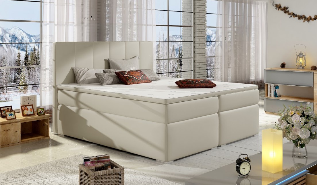 Elegantní postel disponuje vysokým, prošívaným čelem. Postel zdobí plastové nohy ve stříbrném dezénu. Pro dosažení optimálního pohodlí byla použita 20 cm vysoká pružinová matrace typu bonnel, která je vybavena z každé strany vrstvou PUR pěny T25. Pro lepší pohodlí je vrchní část postele doplněna o 4 cm podložku z pěny. Postel má dva úložné prostory, které můžete použít na uložení lůžkovin. Potahová látka jako na hlavním obrázku - krémová eko kůže. Postel boxspring není určena do prostoru, nemá očalouněná záda (očalounění zad za příplatek, na dotaz). Maximální nosnost jedné postele 110 kg.