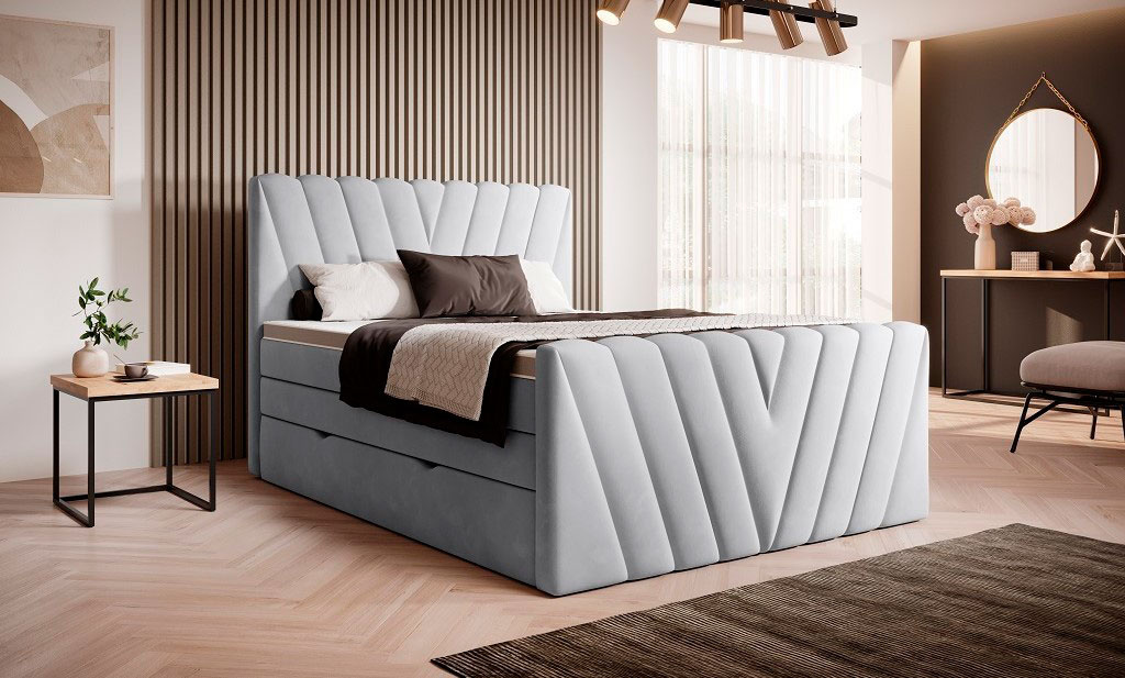 Čalouněná postel Candice v barevném provedení Sola 04 má pevně připevněné matrace bonell o tvrdosti 2/3 a oboustranné vrchní matrace. Hlavní matrace je vyplněna pružinou Bonnel a pěnou T25, díky čemuž dobře podpírá tělo při spánku. Topper, tedy vrchní matrace, je matrace o tvrdosti H3 s taštičkovou pružinou a pěnou T25. Postel má dva úložné prostory. Maximální nosnost postele 230 kg. Výška nožiček 15 cm.