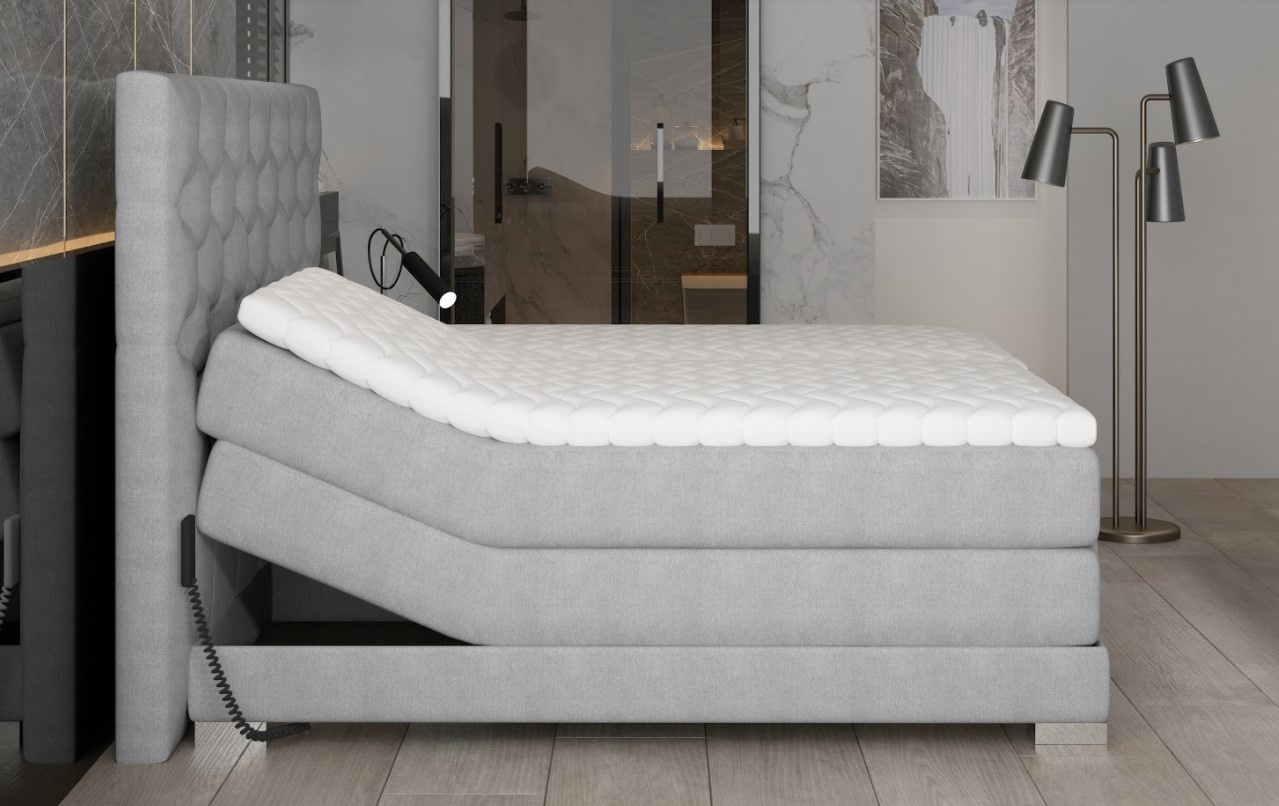 Kontinentální postel Clover s elektrickým ovládáním v dezénu Dora 28 (hnědá) je novým řešením pro lidi, kteří si cení pohodlí na nejvyšší úrovni. Elektrické nastavení umožňuje přizpůsobit výšku matrací individuálním potřebám. Nastavení výšky hlavy a nohou zvyšuje pohodlí a praktičnost celé postele. Nastavitelná postel Clover má tři samostatné matrace pěna T2542+ bonnell, které vytvářejí prostorný prostor na spaní vysoko nad zemí a poskytují vám pohodlí při každodenním vstávání. Matrace jsou ovládány 2 dálkovými ovladači umístěnými na obou stranách postele. Boxspring Clover se stabilizuje na chromovaných nohách, díky čemuž postel vypadá velmi působivě. Tiché a plynulé zvedání zad a nohou praktickým dálkovým ovládáním zaručuje relaxační odpočinek a hluboký spánek. Odolný rám je zcela potažen čalounickou látkou. Vysoké, měkké čelo postele s pravidelným prošíváním vypadá elegantně a moderně a navíc zakrývá zeď. Spací plocha 140 x 200 cm. Zboží dodáváme v demontu.