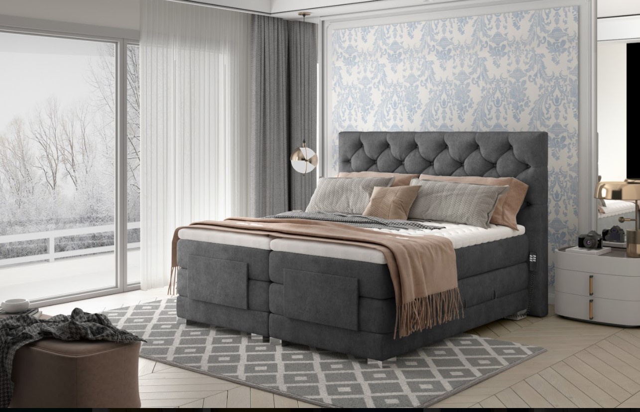 Kontinentální postel Clover s elektrickým ovládáním v dezénu Dora 95 (tmavě šedá) je novým řešením pro lidi, kteří si cení pohodlí na nejvyšší úrovni. Elektrické nastavení umožňuje přizpůsobit výšku matrací individuálním potřebám. Nastavení výšky hlavy a nohou zvyšuje pohodlí a praktičnost celé postele. Nastavitelná postel Clover má tři samostatné matrace pěna T2542+ bonnell, které vytvářejí prostorný prostor na spaní vysoko nad zemí a poskytují vám pohodlí při každodenním vstávání. Matrace jsou ovládány 2 dálkovými ovladači umístěnými na obou stranách postele. Boxspring Clover se stabilizuje na chromovaných nohách, díky čemuž postel vypadá velmi působivě. Tiché a plynulé zvedání zad a nohou praktickým dálkovým ovládáním zaručuje relaxační odpočinek a hluboký spánek. Odolný rám je zcela potažen čalounickou látkou. Vysoké, měkké čelo postele s pravidelným prošíváním vypadá elegantně a moderně a navíc zakrývá zeď. Spací plocha 140 x 200 cm. Zboží dodáváme v demontu.