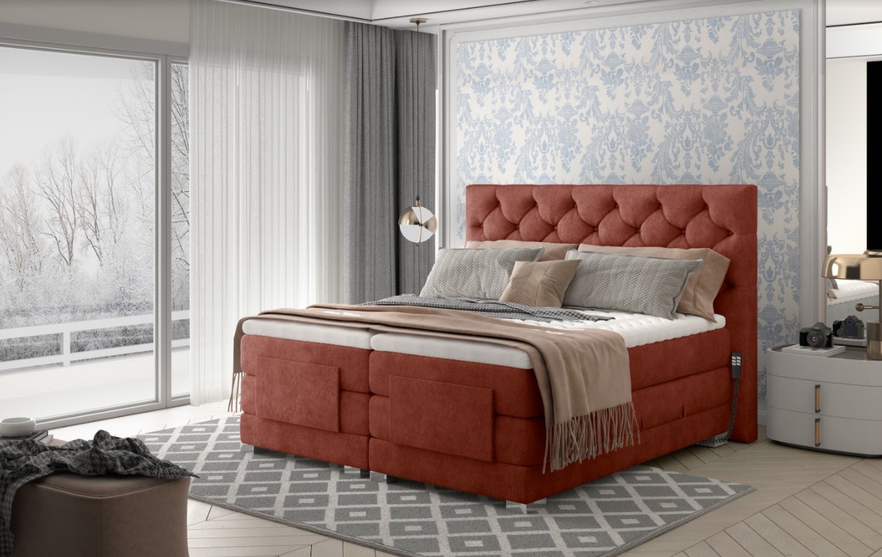 Kontinentální postel Clover s elektrickým ovládáním v dezénu Dora 63 (měděná) je novým řešením pro lidi, kteří si cení pohodlí na nejvyšší úrovni. Elektrické nastavení umožňuje přizpůsobit výšku matrací individuálním potřebám. Nastavení výšky hlavy a nohou zvyšuje pohodlí a praktičnost celé postele. Nastavitelná postel Clover má tři samostatné matrace pěna T2542+ bonnell, které vytvářejí prostorný prostor na spaní vysoko nad zemí a poskytují vám pohodlí při každodenním vstávání. Matrace jsou ovládány 2 dálkovými ovladači umístěnými na obou stranách postele. Boxspring Clover se stabilizuje na chromovaných nohách, díky čemuž postel vypadá velmi působivě. Tiché a plynulé zvedání zad a nohou praktickým dálkovým ovládáním zaručuje relaxační odpočinek a hluboký spánek. Odolný rám je zcela potažen čalounickou látkou. Vysoké, měkké čelo postele s pravidelným prošíváním vypadá elegantně a moderně a navíc zakrývá zeď. Spací plocha 160 x 200 cm. Zboží dodáváme v demontu.