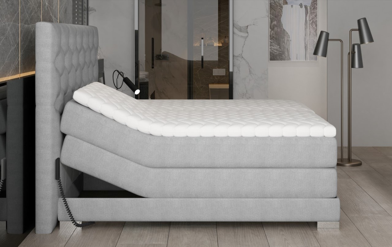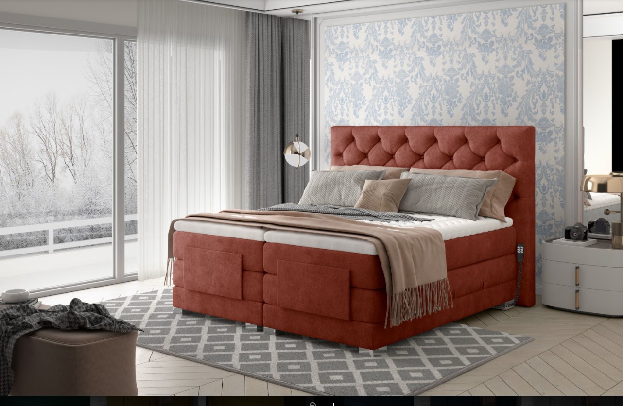 Kontinentální postel Clover s elektrickým ovládáním v dezénu Dora 63 (měděná) je novým řešením pro lidi, kteří si cení pohodlí na nejvyšší úrovni. Elektrické nastavení umožňuje přizpůsobit výšku matrací individuálním potřebám. Nastavení výšky hlavy a nohou zvyšuje pohodlí a praktičnost celé postele. Nastavitelná postel Clover má tři samostatné matrace pěna T2542+ bonnell, které vytvářejí prostorný prostor na spaní vysoko nad zemí a poskytují vám pohodlí při každodenním vstávání. Matrace jsou ovládány 2 dálkovými ovladači umístěnými na obou stranách postele. Boxspring Clover se stabilizuje na chromovaných nohách, díky čemuž postel vypadá velmi působivě. Tiché a plynulé zvedání zad a nohou praktickým dálkovým ovládáním zaručuje relaxační odpočinek a hluboký spánek. Odolný rám je zcela potažen čalounickou látkou. Vysoké, měkké čelo postele s pravidelným prošíváním vypadá elegantně a moderně a navíc zakrývá zeď. Spací plocha 180 x 200 cm. Zboží dodáváme v demontu.