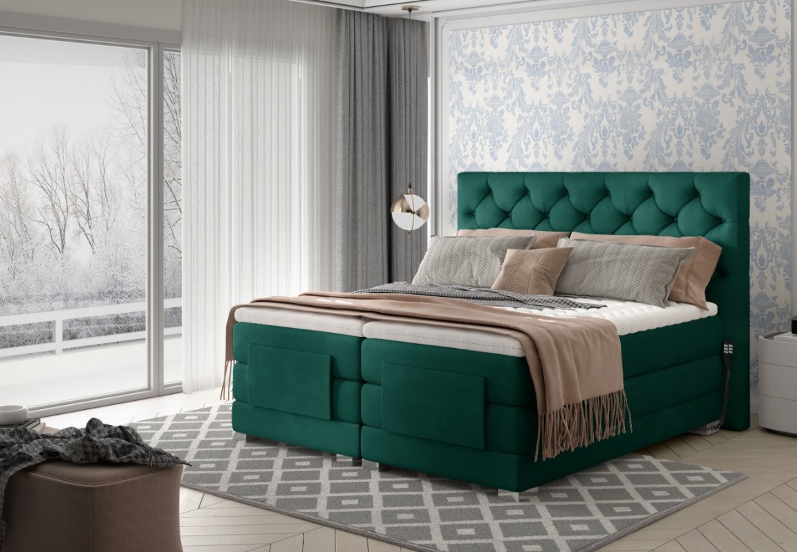 Kontinentální postel Clover s elektrickým ovládáním v dezénu Monolith 37 (zelená) je novým řešením pro lidi, kteří si cení pohodlí na nejvyšší úrovni. Elektrické nastavení umožňuje přizpůsobit výšku matrací individuálním potřebám. Nastavení výšky hlavy a nohou zvyšuje pohodlí a praktičnost celé postele. Nastavitelná postel Clover má tři samostatné matrace pěna T2542+ bonnell, které vytvářejí prostorný prostor na spaní vysoko nad zemí a poskytují vám pohodlí při každodenním vstávání. Matrace jsou ovládány 2 dálkovými ovladači umístěnými na obou stranách postele. Boxspring Clover se stabilizuje na chromovaných nohách, díky čemuž postel vypadá velmi působivě. Tiché a plynulé zvedání zad a nohou praktickým dálkovým ovládáním zaručuje relaxační odpočinek a hluboký spánek. Odolný rám je zcela potažen čalounickou látkou. Vysoké, měkké čelo postele s pravidelným prošíváním vypadá elegantně a moderně a navíc zakrývá zeď. Spací plocha 180 x 200 cm. Zboží dodáváme v demontu.