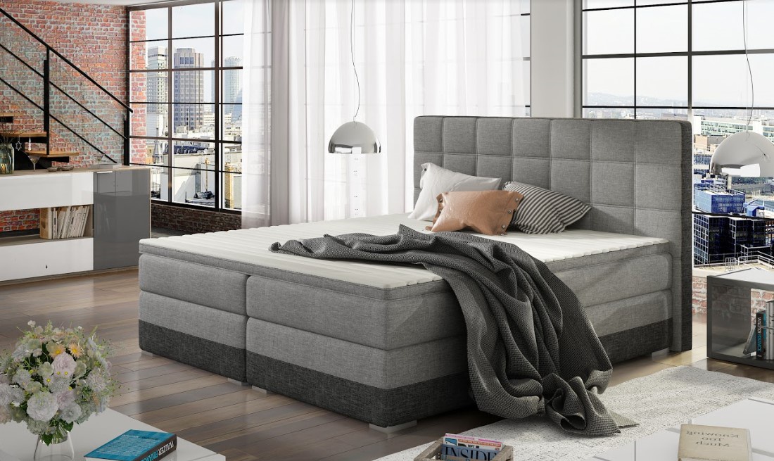 Elegantní postel disponuje vysokým, prošívaným čelem. Postel zdobí plastové nohy ve stříbrném dezénu. Pružinová matrace je vysoká 20 cm. Pro lepší pohodlí je vrchní část postele doplněna o 4 cm podložku z pěny. Postel má dva úložné prostory na lůžkoviny. Potahová látka jako na hlavním obrázku - kombinace tmavošedé a šedé látky. Maximální nosnost jedné postele 110 kg.