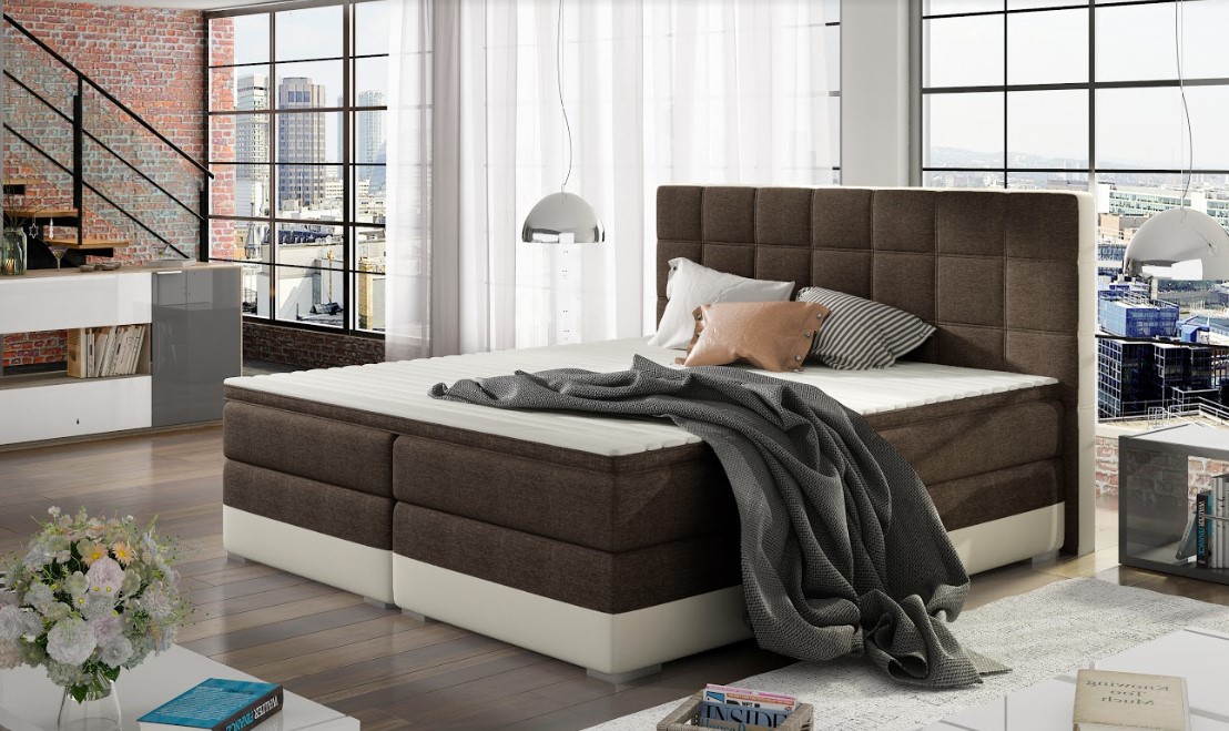 Elegantní postel disponuje vysokým, prošívaným čelem. Postel zdobí plastové nohy ve stříbrném dezénu. Pružinová matrace je vysoká 20 cm. Pro lepší pohodlí je vrchní část postele doplněna o 4 cm podložku z pěny. Postel má dva úložné prostory na lůžkoviny. Potahová látka jako na hlavním obrázku - kombinace tmavohnědé látky a krémové eko kůže. Postel boxspring není určena do prostoru, nemá očalouněná záda (očalounění zad za příplatek, na dotaz). Maximální nosnost jedné postele 110 kg.