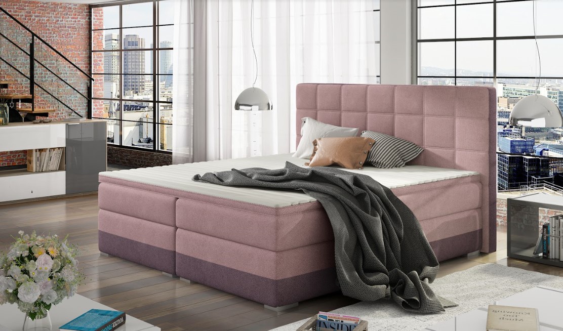 Elegantní postel disponuje vysokým, prošívaným čelem. Postel zdobí plastové nohy ve stříbrném dezénu. Pružinová matrace je vysoká 20 cm. Pro lepší pohodlí je vrchní část postele doplněna o 4 cm podložku z pěny. Postel má dva úložné prostory na lůžkoviny. Potahová látka jako na hlavním obrázku - kombinace růžové a fialové látky. Postel boxspring není určena do prostoru, nemá očalouněná záda (očalounění zad za příplatek, na dotaz). Maximální nosnost jedné postele 110 kg.