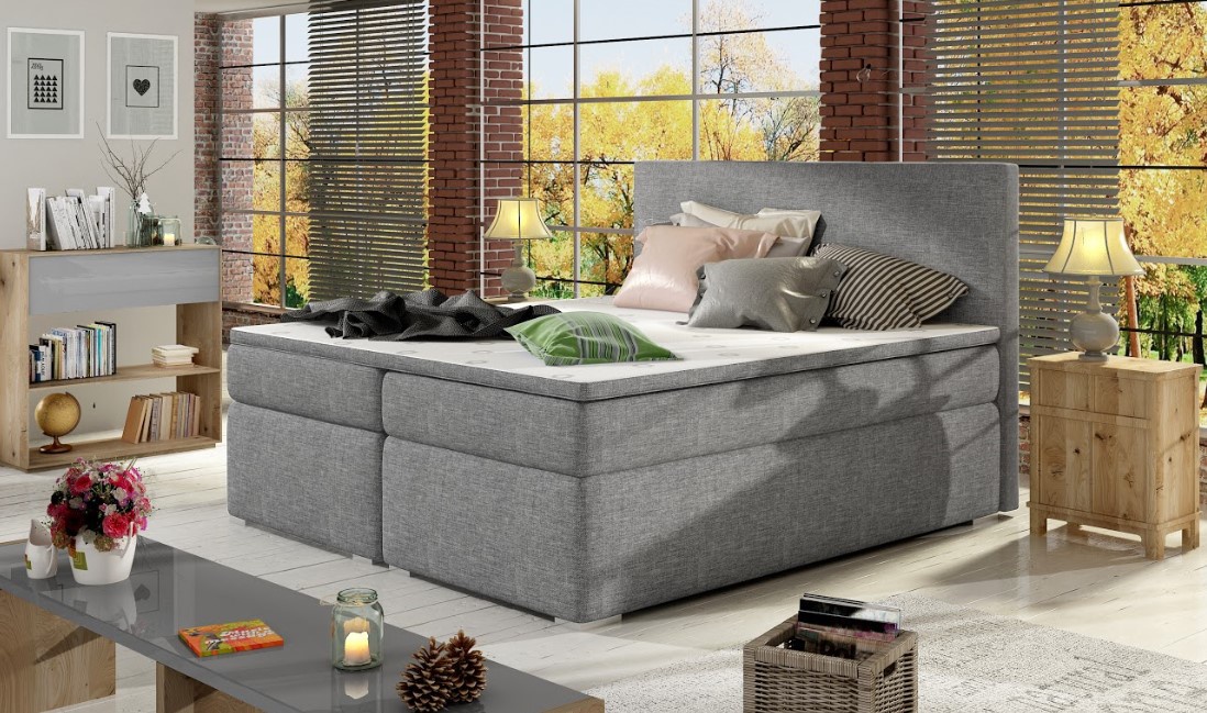 Elegantní postel disponuje vysokým čelem. Postel zdobí plastové nohy ve stříbrném dezénu. Pro dosažení optimálního pohodlí byla použita 20 cm vysoká pružinová matrace typu bonnel, která je vybavena z každé strany vrstvou PUR pěny T25. Pro lepší pohodlí je vrchní část postele doplněna o 4 cm podložku z pěny T21. Postel má dva úložné prostory na lůžkoviny. Exkluzivní výška ložné plochy 60 cm zajišťuje pohodlné vstávání. Potahová látka jako na hlavním obrázku - světle šedá látka. Maximální nosnost jedné postele 110 kg.