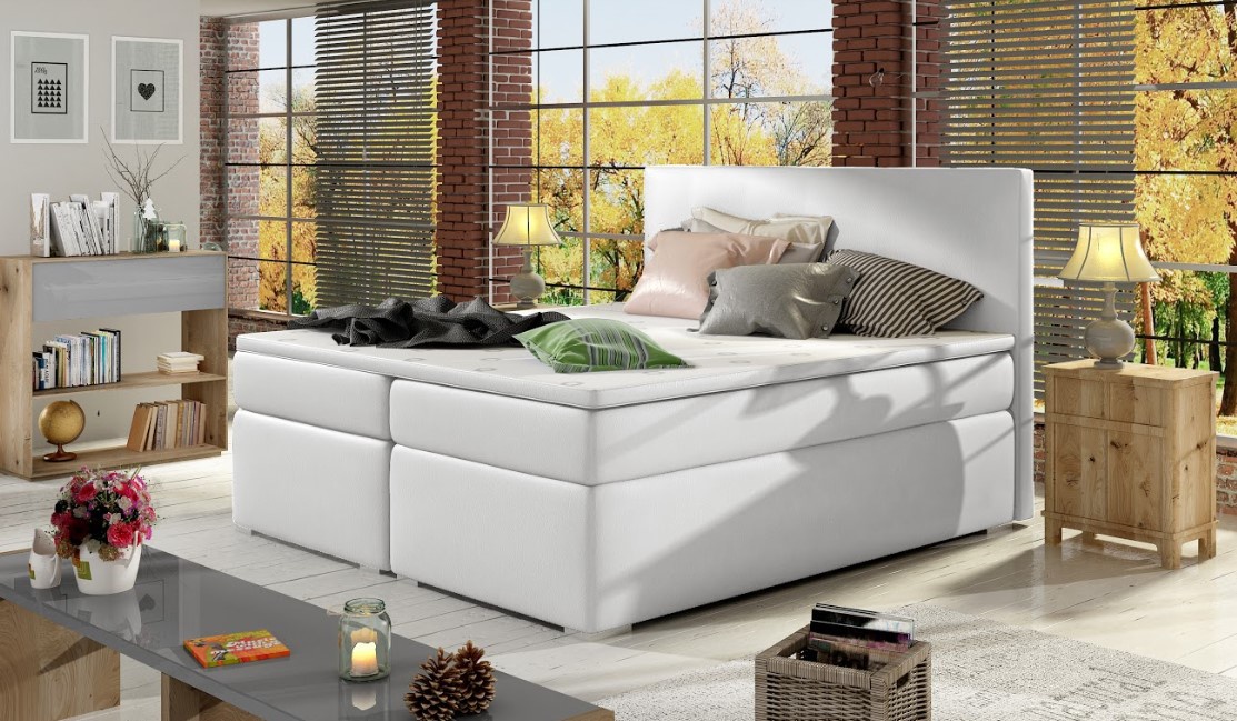 Elegantní postel disponuje vysokým čelem. Postel zdobí plastové nohy ve stříbrném dezénu. Pro dosažení optimálního pohodlí byla použita 20 cm vysoká pružinová matrace typu bonnel, která je vybavena z každé strany vrstvou PUR pěny T25. Pro lepší pohodlí je vrchní část postele doplněna o 4 cm podložku z pěny T21. Postel má dva úložné prostory na lůžkoviny. Exkluzivní výška ložné plochy 60 cm zajišťuje pohodlné vstávání. Potahová látka jako na hlavním obrázku - bílá eko kůže. Postel boxspring není určena do prostoru, nemá očalouněná záda (očalounění zad za příplatek, na dotaz). Maximální nosnost jedné postele 110 kg.