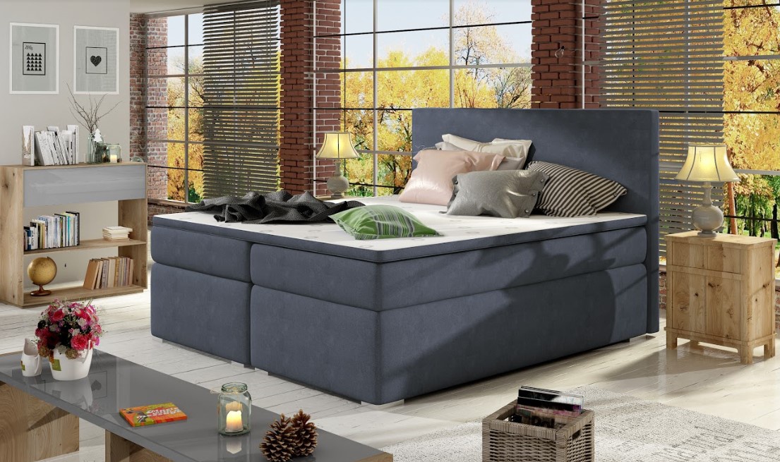 Elegantní postel disponuje vysokým čelem. Postel zdobí plastové nohy ve stříbrném dezénu. Pro dosažení optimálního pohodlí byla použita 20 cm vysoká pružinová matrace typu bonnel, která je vybavena z každé strany vrstvou PUR pěny T25. Pro lepší pohodlí je vrchní část postele doplněna o 4 cm podložku z pěny T21. Postel má dva úložné prostory na lůžkoviny. Exkluzivní výška ložné plochy 60 cm zajišťuje pohodlné vstávání. Potahová látka jako na hlavním obrázku - modrá látka. Postel boxspring není určena do prostoru, nemá očalouněná záda (očalounění zad za příplatek, na dotaz). Maximální nosnost jedné postele 110 kg.