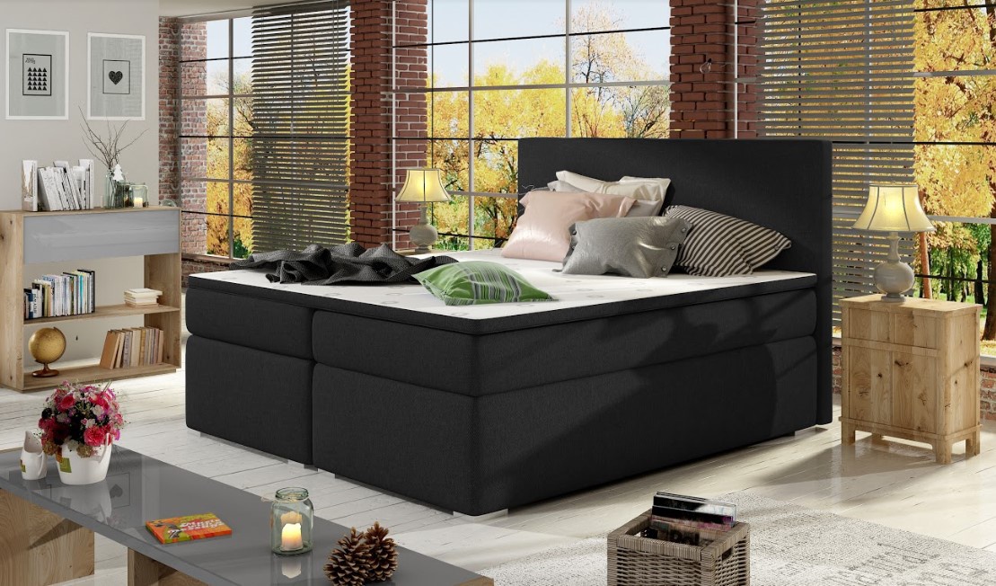 Elegantní postel disponuje vysokým čelem. Postel zdobí plastové nohy ve stříbrném dezénu. Pro dosažení optimálního pohodlí byla použita 20 cm vysoká pružinová matrace typu bonnel, která je vybavena z každé strany vrstvou PUR pěny T25. Pro lepší pohodlí je vrchní část postele doplněna o 4 cm podložku z pěny T21. Postel má dva úložné prostory na lůžkoviny. Exkluzivní výška ložné plochy 60 cm zajišťuje pohodlné vstávání. Potahová látka jako na hlavním obrázku - černá látka. Postel boxspring není určena do prostoru, nemá očalouněná záda (očalounění zad za příplatek, na dotaz). Maximální nosnost jedné postele 110 kg.