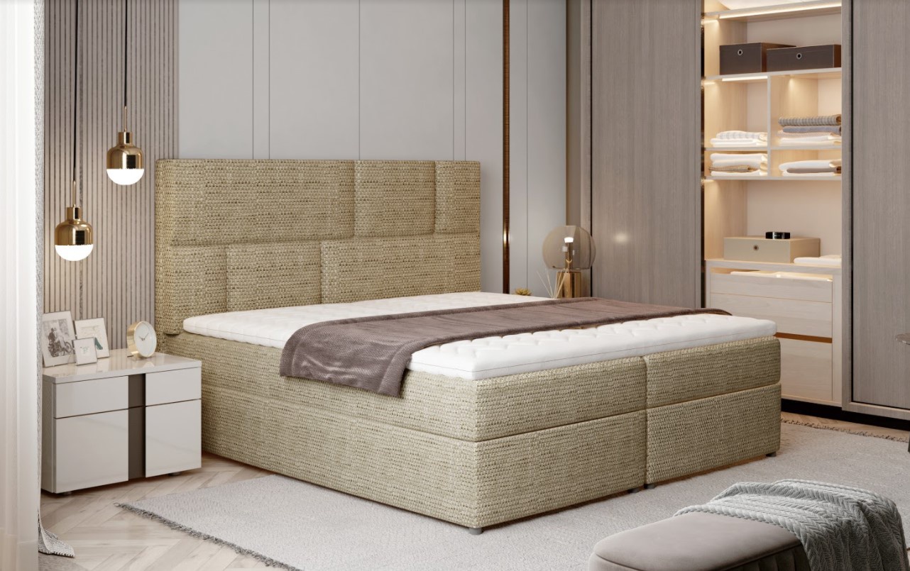 Postel Boxspring Florence s úložným prostorem na první pohled zaujme elegantním designem. Postel je vyrobena v kombinací dřeva a dřevotřísky s pěkným čalouněním z příjemného materiálu. Postel disponuje několika vkusnými doplňky jako je prošívané čelo či kovové nožky vysoké 3 cm. Pro dosažení optimálního pohodlí byla použita 15 cm vysoké oboustranné pružinové matrace typu Bonnel, která je vybavena z každé strany vrstvou PUR pěny T25. Tvrdost matrace H3 má potah na zip, který je pratelný na 40 st. - je hypoalergenní. Pro lepší pohodlí je vrchní část postele doplněna o tooper z pěny, který je vysoký 4 cm. Postel má dva úložné prostory na lůžkoviny. Boxspring zajišťuje dokonalou cirkulaci vzduchu a odvádí tak většinu vlhkosti mimo lůžko. Potahová látka jako na hlavní fotografii - světlé béžová látka. Na výběr máte z mnoha barevných variant. Maximální nosnost jedné postele 110 kg. Zboží dodáváme v demontu.