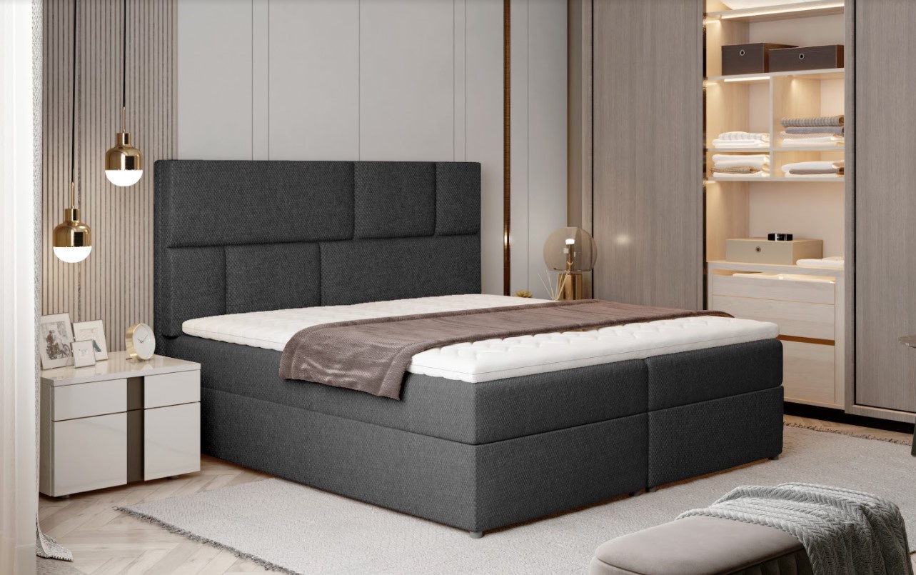 Postel Boxspring Florence s úložným prostorem na první pohled zaujme elegantním designem. Postel je vyrobena v kombinací dřeva a dřevotřísky s pěkným čalouněním z příjemného materiálu. Postel disponuje několika vkusnými doplňky jako je prošívané čelo či kovové nožky vysoké 3 cm. Pro dosažení optimálního pohodlí byla použita 15 cm vysoké oboustranné pružinové matrace typu Bonnel, která je vybavena z každé strany vrstvou PUR pěny T25. Tvrdost matrace H3 má potah na zip, který je pratelný na 40 st. - je hypoalergenní. Pro lepší pohodlí je vrchní část postele doplněna o tooper z pěny, který je vysoký 4 cm. Postel má dva úložné prostory na lůžkoviny. Boxspring zajišťuje dokonalou cirkulaci vzduchu a odvádí tak většinu vlhkosti mimo lůžko. Potahová látka jako na hlavní fotografii - tmavě šedá látka. Na výběr máte z mnoha barevných variant. Maximální nosnost jedné postele 110 kg. Zboží dodáváme v demontu.