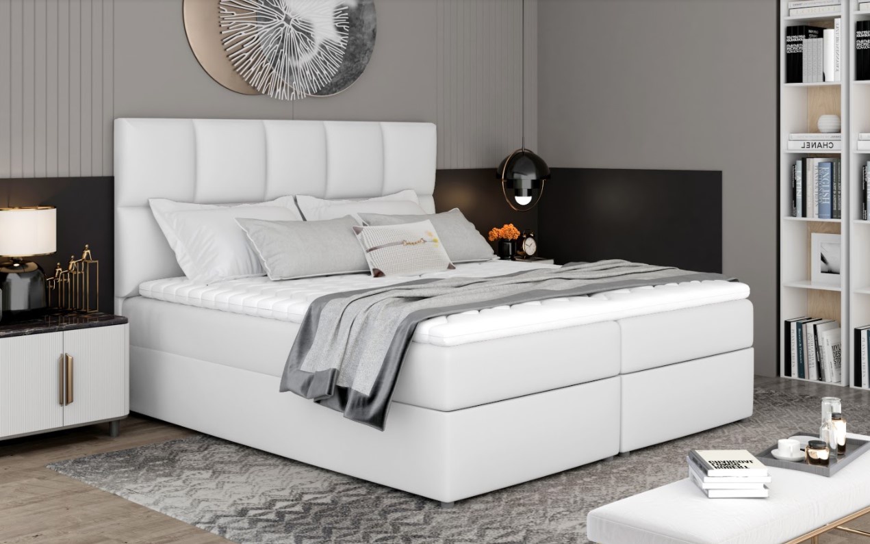 Postel boxspring Glossy s velkým úložným prostorem na první pohled zaujme elegantním designem. Postel je vyrobena v kombinací dřeva a dřevotřísky s pěkným čalouněním z přijemného materiálu. Postel disponuje několika vkusnými doplňky jako je prošívané čelo či kovové nožky. Pro dosažení optimálního pohodlí byla použita 15 cm vysoká oboustranná pružinová matrace typu bonnel, která je vybavena z každé strany vrstvou PUR pěny T25+pružina. Tvrdost matrace H3 má potah na zip, který je pratelný na 40 st. Pro lepší pohodlí je vrchní část postele doplněna o podložku z pěny, která je vysoká 4 cm. Postel má dva úložné prostory na lůžkoviny. Boxspring zajišťuje dokonalou cirkulaci vzduchu a odvádí tak většinu vlhkosti mimo lůžko. Potahová látka jako na hlavní fotografii - bílá látka. Na výběr máte z mnoha barevných variant. Maximální nosnost jedné postele 110 kg. Zboží dodáváme v demontu.