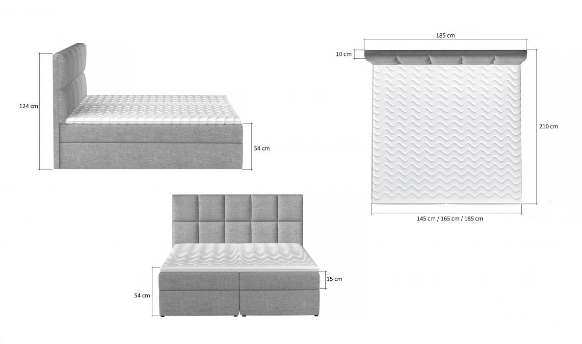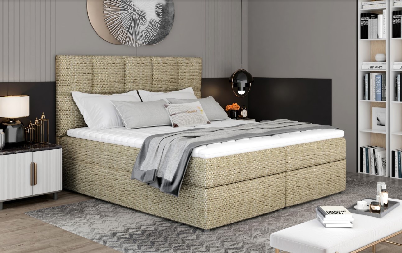 Postel boxspring Glossy s velkým úložným prostorem na první pohled zaujme elegantním designem. Postel je vyrobena v kombinací dřeva a dřevotřísky s pěkným čalouněním z přijemného materiálu. Postel disponuje několika vkusnými doplňky jako je prošívané čelo či kovové nožky. Pro dosažení optimálního pohodlí byla použita 15 cm vysoká oboustranná pružinová matrace typu bonnel, která je vybavena z každé strany vrstvou PUR pěny T25+pružina. Tvrdost matrace H3 má potah na zip, který je pratelný na 40 st. Pro lepší pohodlí je vrchní část postele doplněna o podložku z pěny, která je vysoká 4 cm. Postel má dva úložné prostory na lůžkoviny. Boxspring zajišťuje dokonalou cirkulaci vzduchu a odvádí tak většinu vlhkosti mimo lůžko. Potahová látka jako na hlavní fotografii - světle béžová látka. Na výběr máte z mnoha barevných variant. Maximální nosnost jedné postele 110 kg. Zboží dodáváme v demontu.