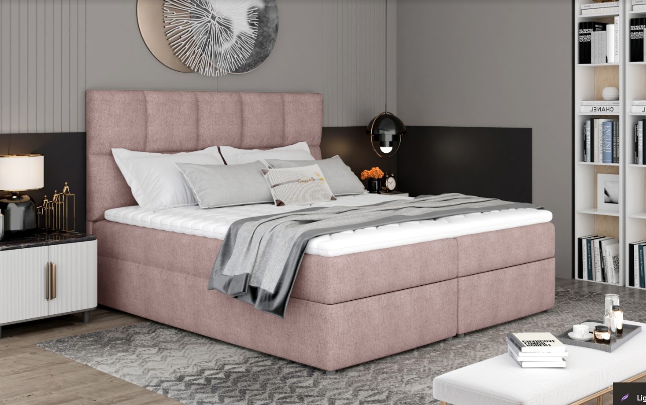 Postel boxspring Glossy s velkým úložným prostorem na první pohled zaujme elegantním designem. Postel je vyrobena v kombinací dřeva a dřevotřísky s pěkným čalouněním z přijemného materiálu. Postel disponuje několika vkusnými doplňky jako je prošívané čelo či kovové nožky. Pro dosažení optimálního pohodlí byla použita 15 cm vysoká oboustranná pružinová matrace typu bonnel, která je vybavena z každé strany vrstvou PUR pěny T25+pružina. Tvrdost matrace H3 má potah na zip, který je pratelný na 40 st. Pro lepší pohodlí je vrchní část postele doplněna o podložku z pěny, která je vysoká 4 cm. Postel má dva úložné prostory na lůžkoviny. Boxspring zajišťuje dokonalou cirkulaci vzduchu a odvádí tak většinu vlhkosti mimo lůžko. Potahová látka jako na hlavní fotografii - růžová látka. Na výběr máte z mnoha barevných variant. Maximální nosnost jedné postele 110 kg. Zboží dodáváme v demontu.