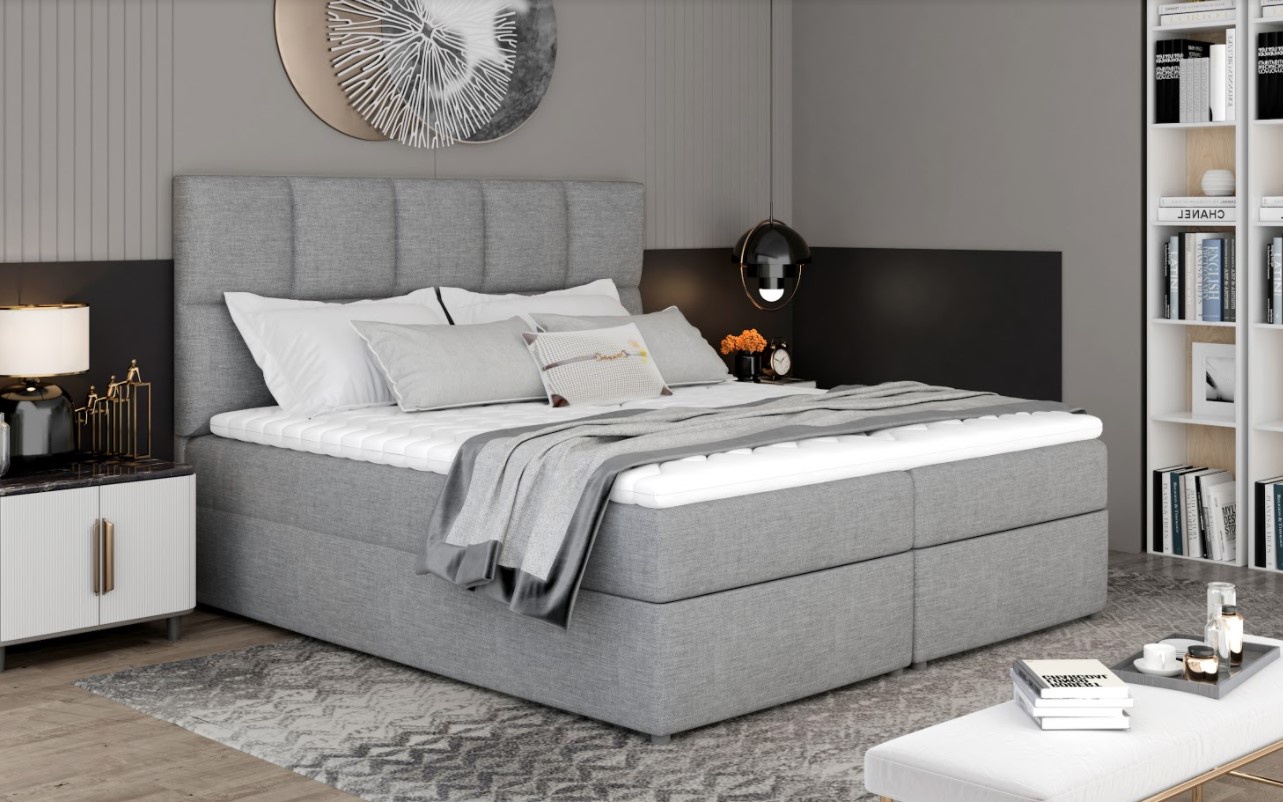 Postel boxspring Glossy s velkým úložným prostorem na první pohled zaujme elegantním designem. Postel je vyrobena v kombinací dřeva a dřevotřísky s pěkným čalouněním z přijemného materiálu. Postel disponuje několika vkusnými doplňky jako je prošívané čelo či kovové nožky. Pro dosažení optimálního pohodlí byla použita 15 cm vysoká oboustranná pružinová matrace typu bonnel, která je vybavena z každé strany vrstvou PUR pěny T25+pružina. Tvrdost matrace H3 má potah na zip, který je pratelný na 40 st. Pro lepší pohodlí je vrchní část postele doplněna o podložku z pěny, která je vysoká 4 cm. Postel má dva úložné prostory na lůžkoviny. Boxspring zajišťuje dokonalou cirkulaci vzduchu a odvádí tak většinu vlhkosti mimo lůžko. Potahová látka jako na hlavní fotografii - světle šedá látka. Na výběr máte z mnoha barevných variant. Maximální nosnost jedné postele 110 kg. Zboží dodáváme v demontu.