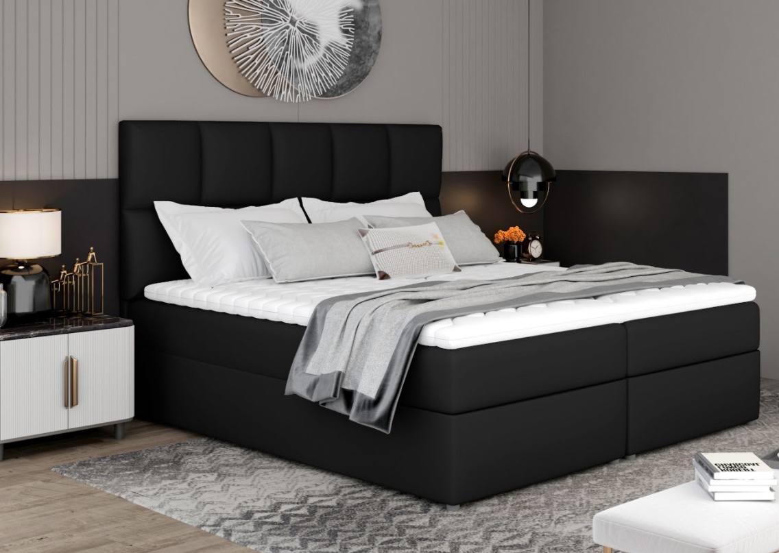 Postel boxspring Glossy s velkým úložným prostorem na první pohled zaujme elegantním designem. Postel je vyrobena v kombinací dřeva a dřevotřísky s pěkným čalouněním z přijemného materiálu. Postel disponuje několika vkusnými doplňky jako je prošívané čelo či kovové nožky. Pro dosažení optimálního pohodlí byla použita 15 cm vysoká oboustranná pružinová matrace typu bonnel, která je vybavena z každé strany vrstvou PUR pěny T25+pružina. Tvrdost matrace H3 má potah na zip, který je pratelný na 40 st. Pro lepší pohodlí je vrchní část postele doplněna o podložku z pěny, která je vysoká 4 cm. Postel má dva úložné prostory na lůžkoviny. Boxspring zajišťuje dokonalou cirkulaci vzduchu a odvádí tak většinu vlhkosti mimo lůžko. Potahová látka jako na hlavní fotografii - černá látka. Na výběr máte z mnoha barevných variant. Maximální nosnost jedné postele 110 kg. Zboží dodáváme v demontu.
