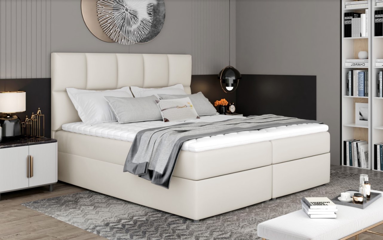 Postel boxspring Glossy s velkým úložným prostorem na první pohled zaujme elegantním designem. Postel je vyrobena v kombinací dřeva a dřevotřísky s pěkným čalouněním z přijemného materiálu. Postel disponuje několika vkusnými doplňky jako je prošívané čelo či kovové nožky. Pro dosažení optimálního pohodlí byla použita 15 cm vysoká oboustranná pružinová matrace typu bonnel, která je vybavena z každé strany vrstvou PUR pěny T25+pružina. Tvrdost matrace H3 má potah na zip, který je pratelný na 40 st. Pro lepší pohodlí je vrchní část postele doplněna o podložku z pěny, která je vysoká 4 cm. Postel má dva úložné prostory na lůžkoviny. Boxspring zajišťuje dokonalou cirkulaci vzduchu a odvádí tak většinu vlhkosti mimo lůžko. Potahová látka jako na hlavní fotografii - krémová látka. Na výběr máte z mnoha barevných variant. Maximální nosnost jedné postele 110 kg. Zboží dodáváme v demontu.